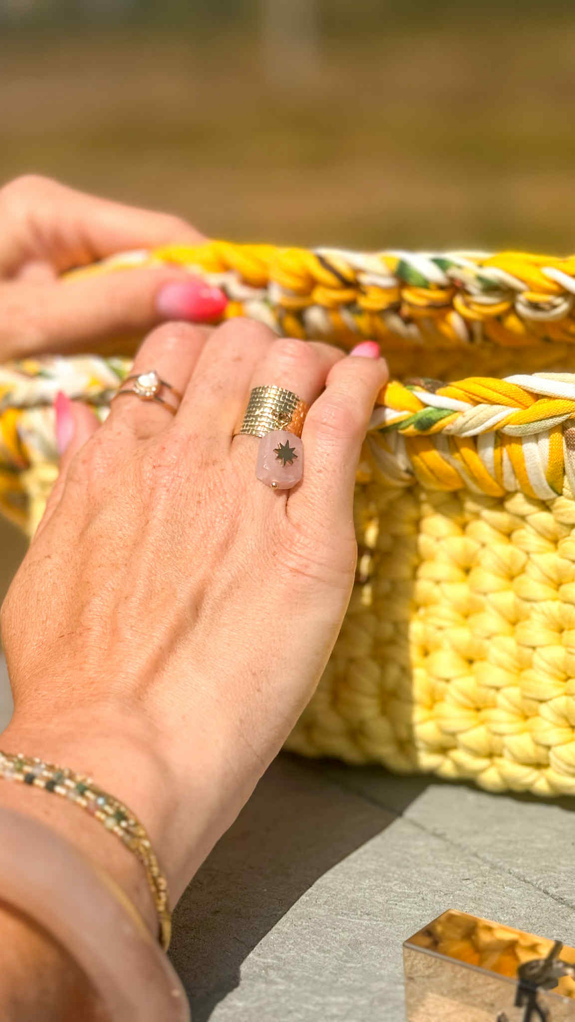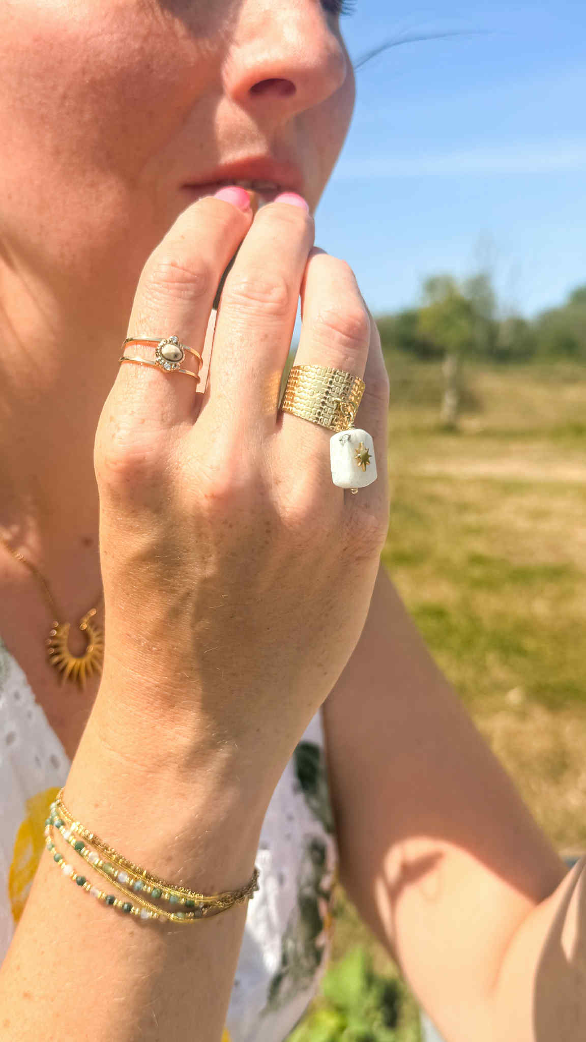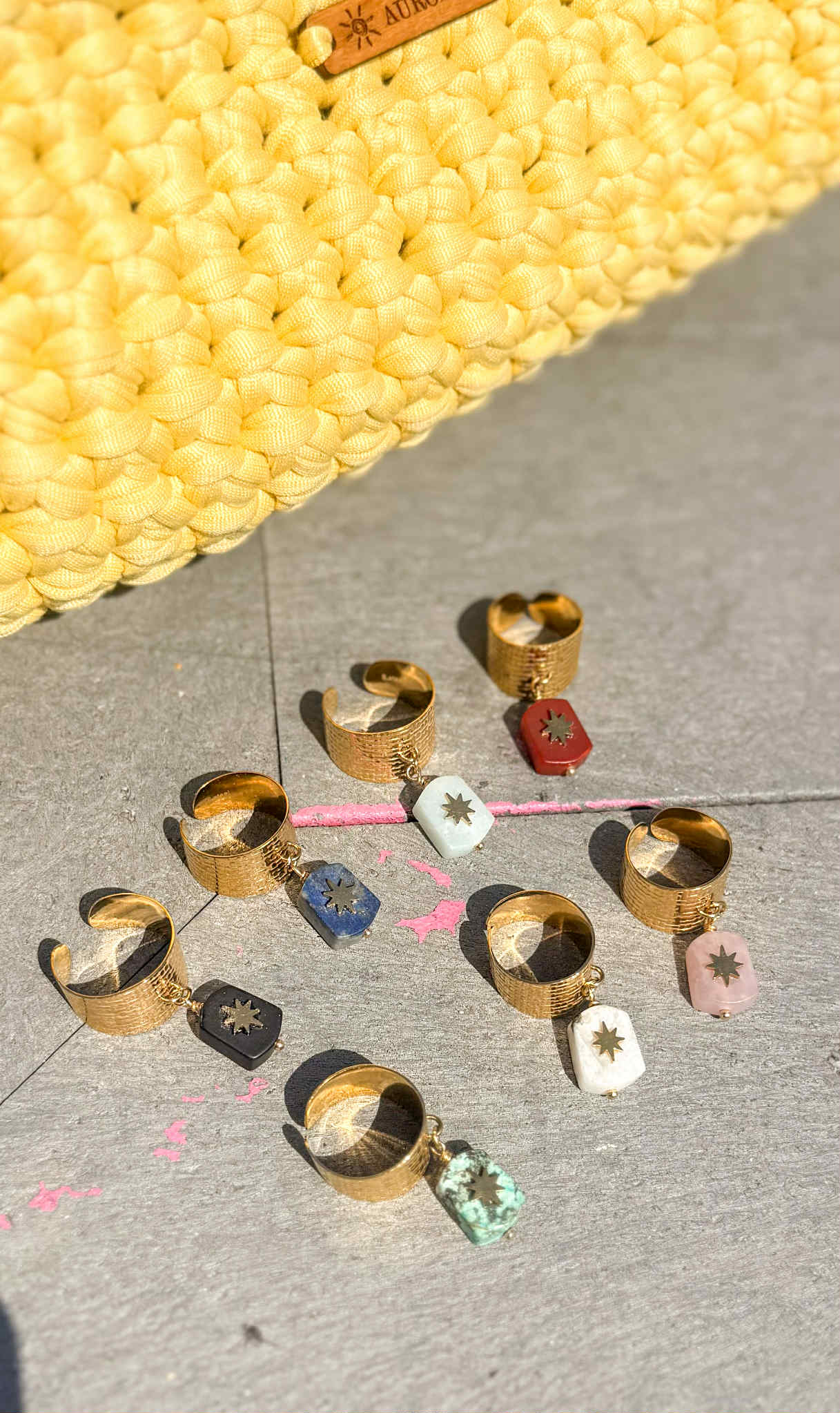 Leur anneau texturé en acier inoxydable doré se pare d'une breloque délicate, taillée dans une pierre semi-précieuse et gravée d'un soleil, symbole d'énergie et de lumière. Chaque modèle est unique, reflétant les nuances et veines propres à chaque pierre.