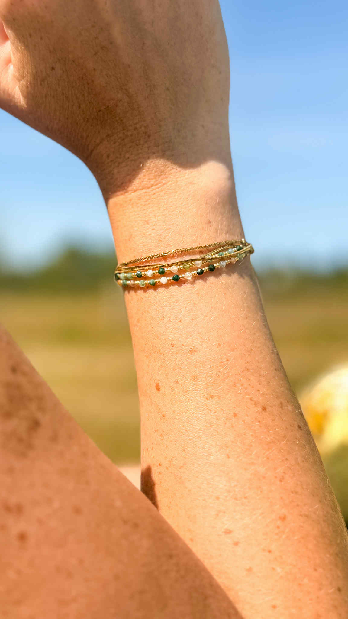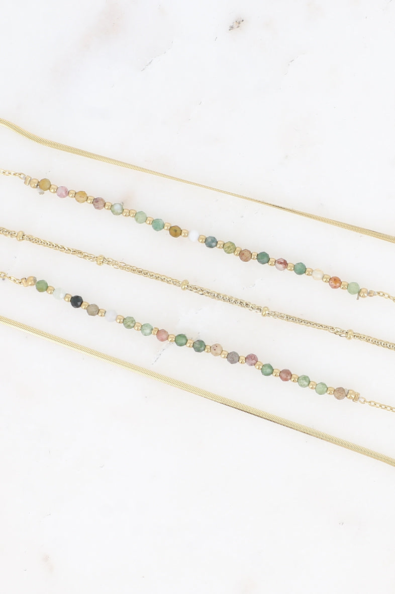 Ses cinq chaînes délicates se mêlent harmonieusement : deux mailles miroir scintillantes, deux mailles forçat ornées de pierres naturelles, et une chaîne torsadée sublimée de petites perles dorées.Un bijou raffiné, à porter seul pour un look minimaliste ou en accumulation pour un effet bohème chic.
