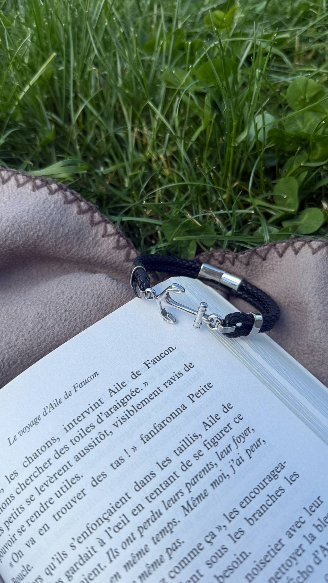 Conçu en cuir noir tressé avec des finitions en acier inoxydable argenté, il allie robustesse et style. Son fermoir magnétique, pratique et sécurisé, permet de l'enfiler facilement au quotidien, sans compromis sur l'élégance.
