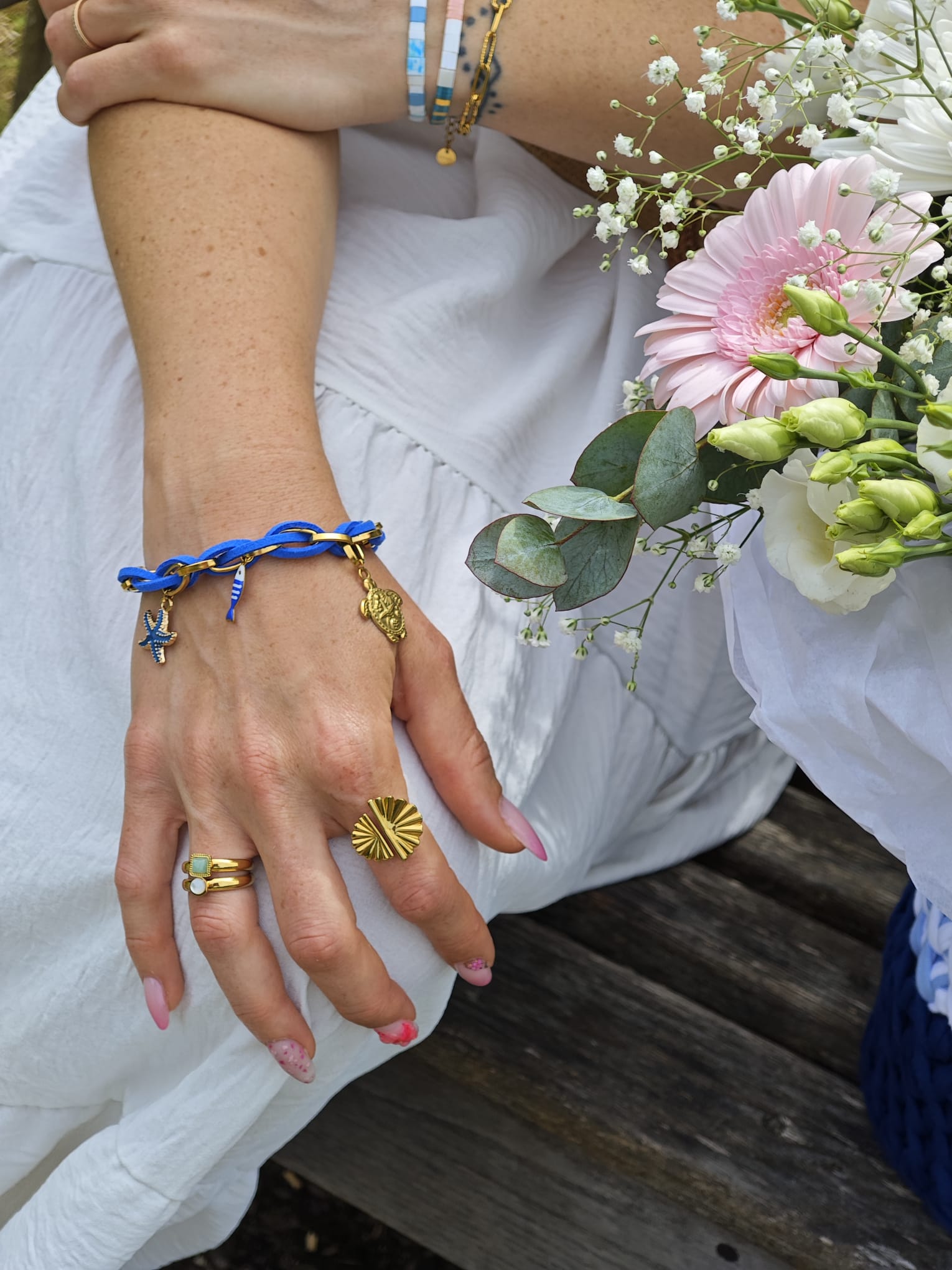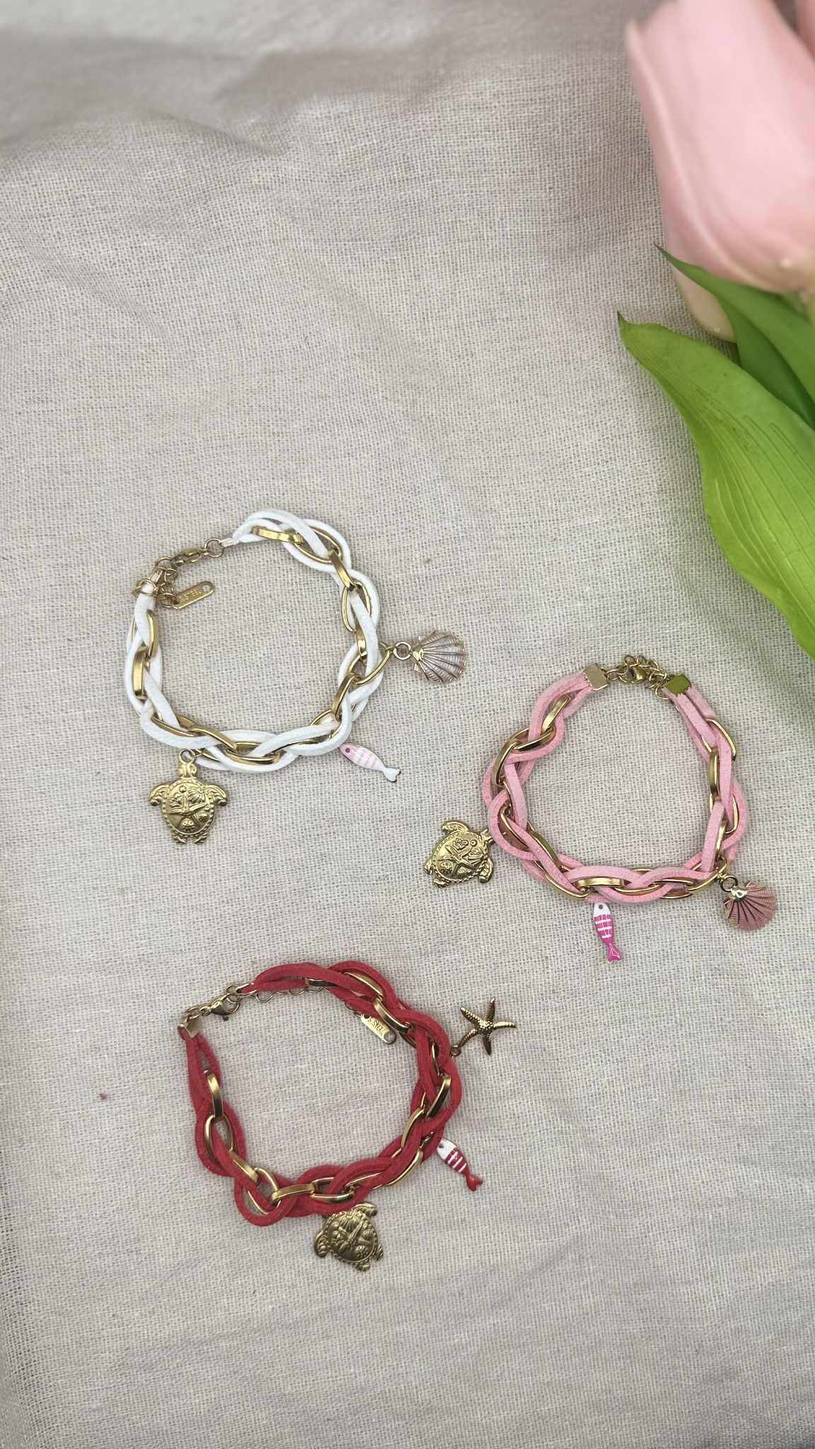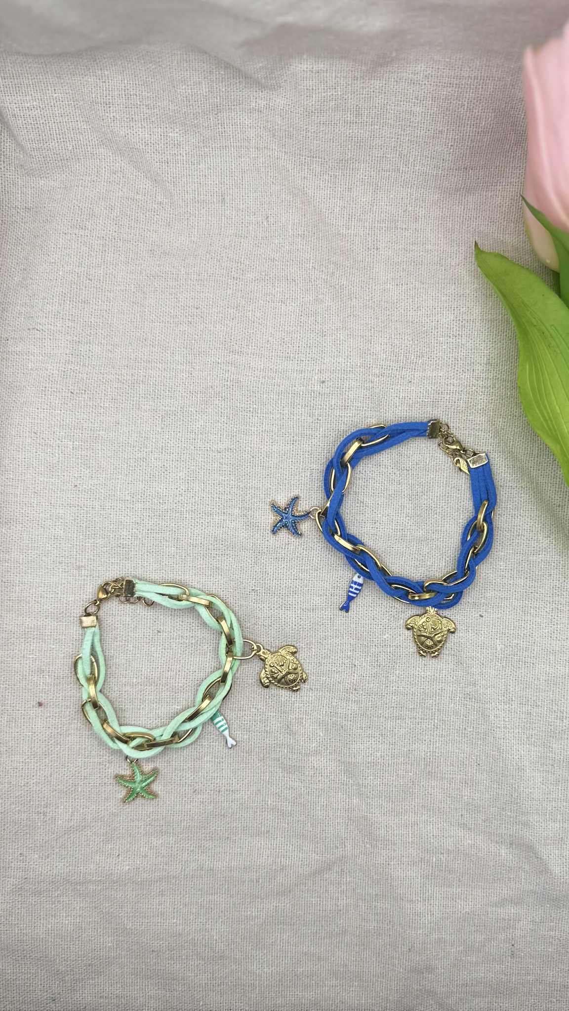 Sa chaîne dorée tressée de fil coloré évoque les liens qu'on noue avec les choses simples, les petits bonheurs et les souvenirs d'été. Chaque breloque - tortue, coquillage, poisson ou étoile de mer - est une escale, une histoire, un clin d'oeil à l'enfance et à l'océan.