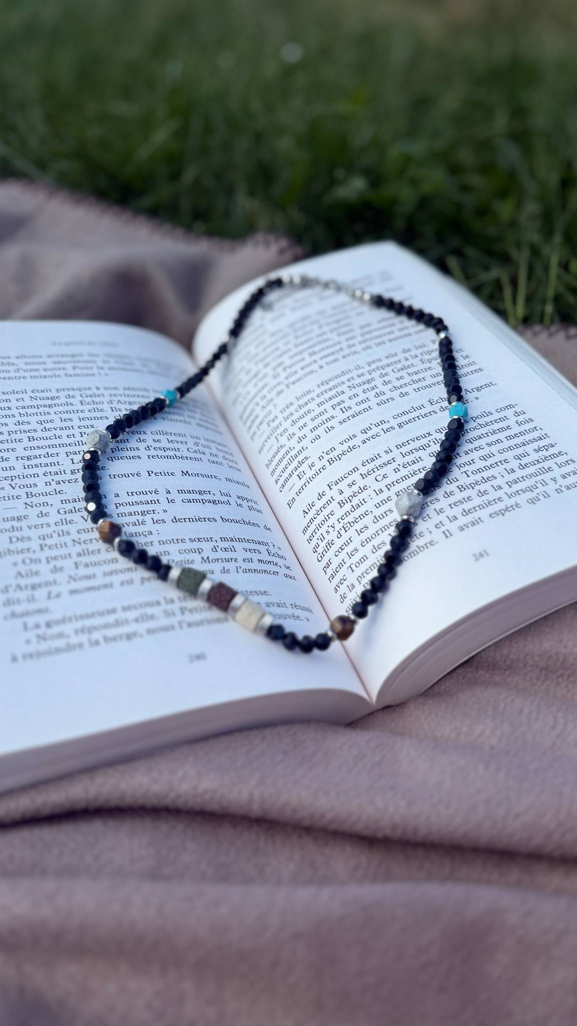 Mélange de perles noires mate avec des perles aux touches colorées (marron, turquoise, gris, vert kaki...)