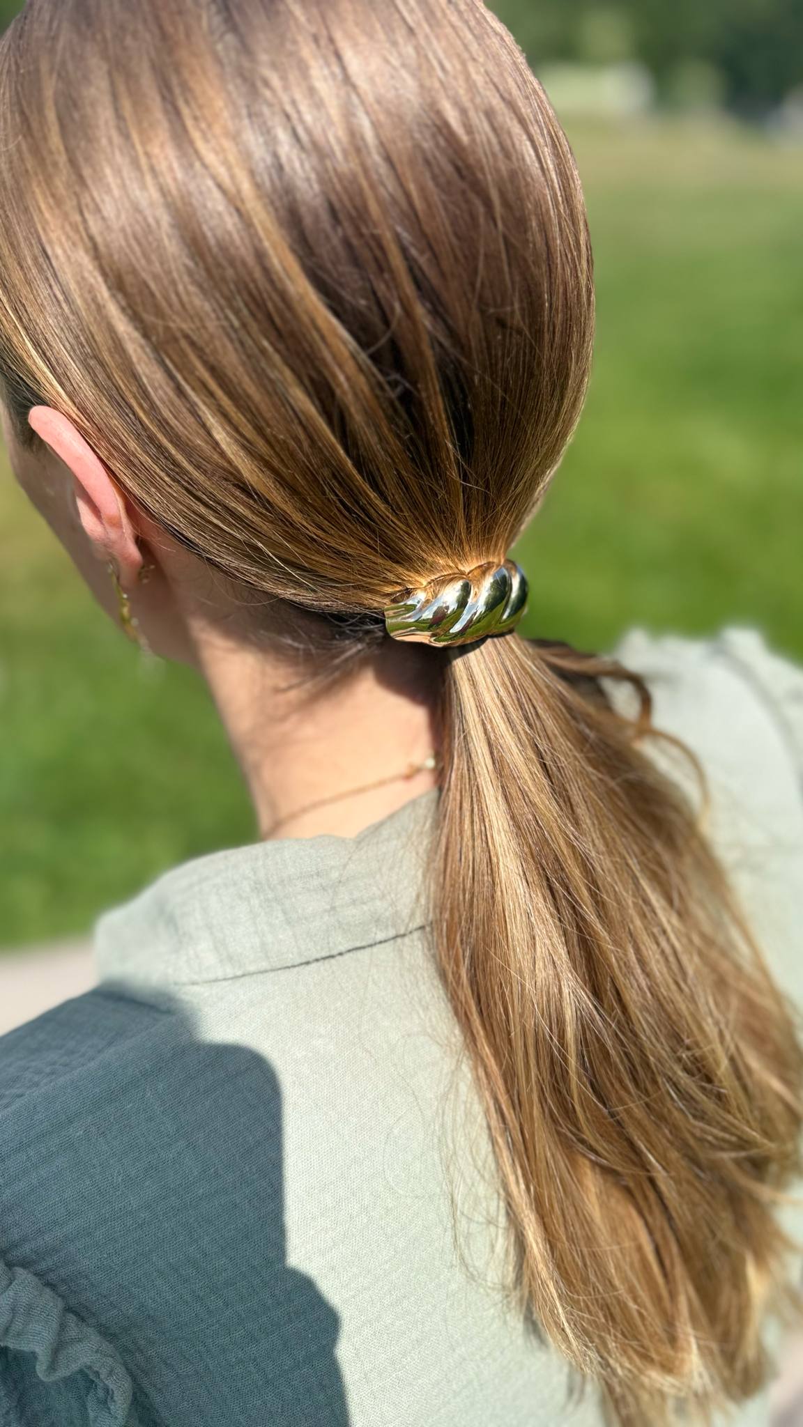 Entièrement en métal doré il revisite le classique chouchou avec une touche de lumière et de raffinement. Il se glisse dans un chignon ou une queue-de-cheval pour un effet waouh sans effort.