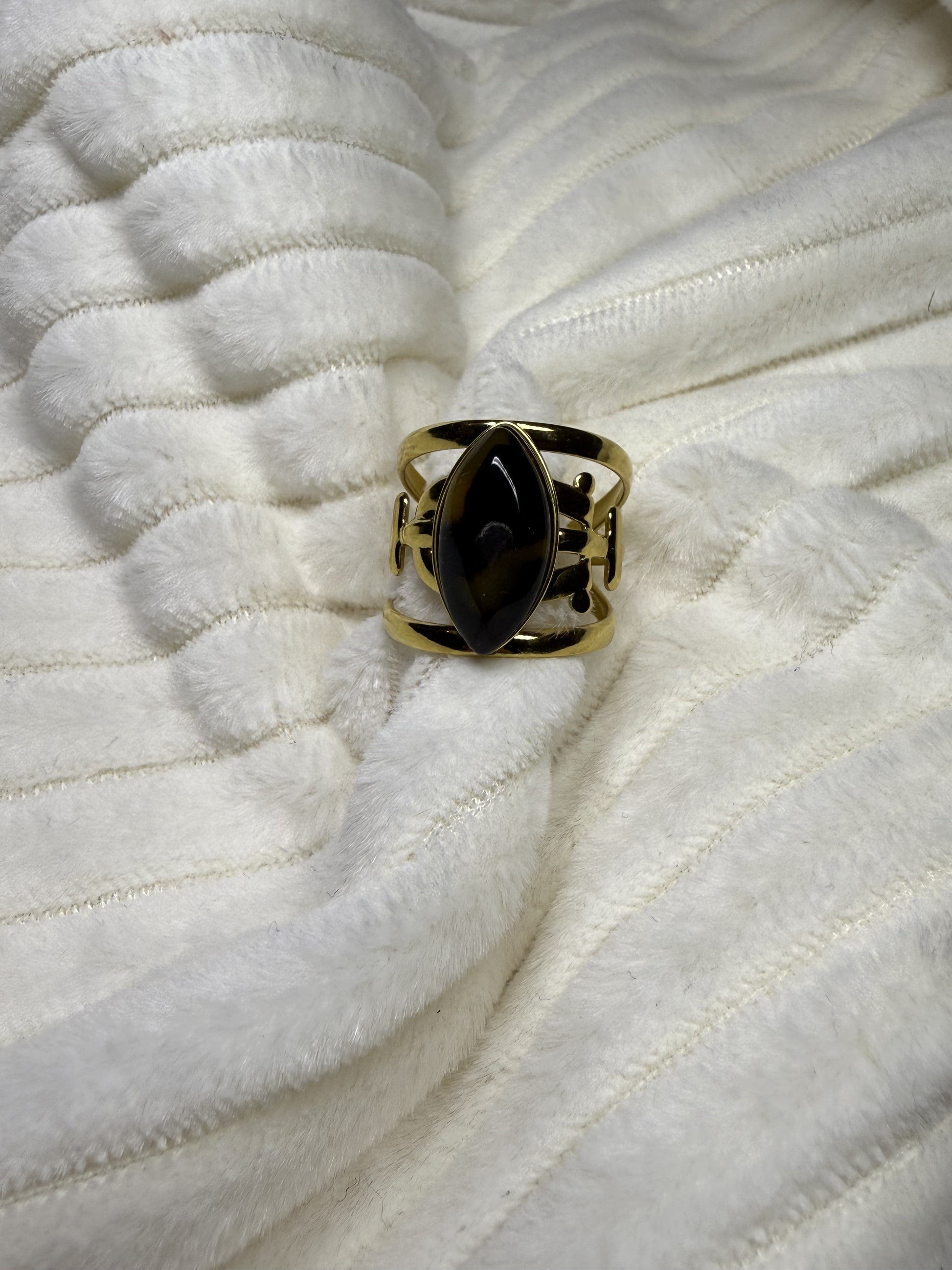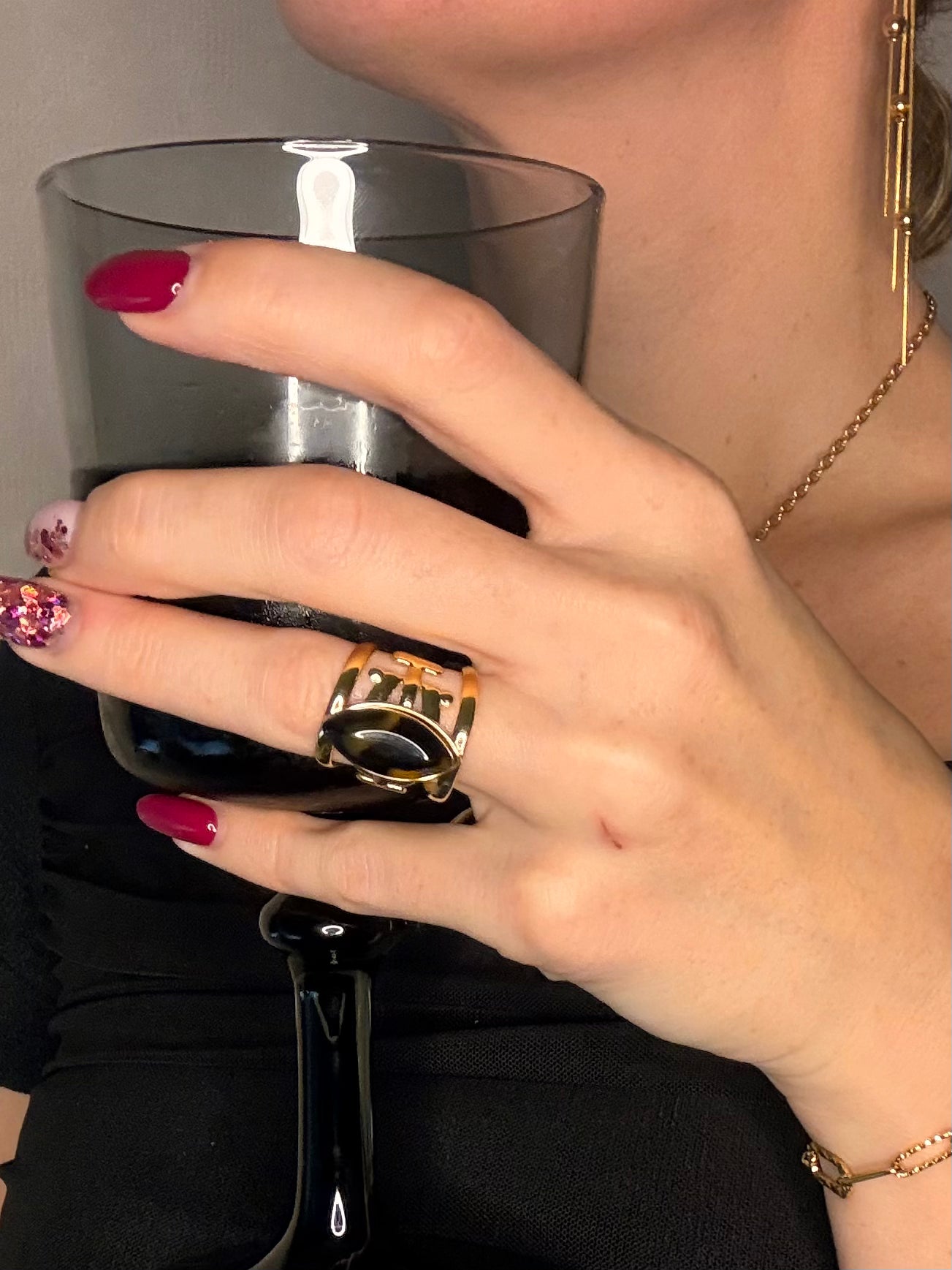 Son anneau ajouré met en valeur une magnifique pierre aux reflets profonds, oscillant entre noir intense et nuances plus douces selon la lumière. Ce contraste subtil apporte une dimension envoûtante à ce bijou, parfait pour celles qui aiment se démarquer. Imposante et distinguée, Chipie sublime chaque geste avec une touche de singularité.