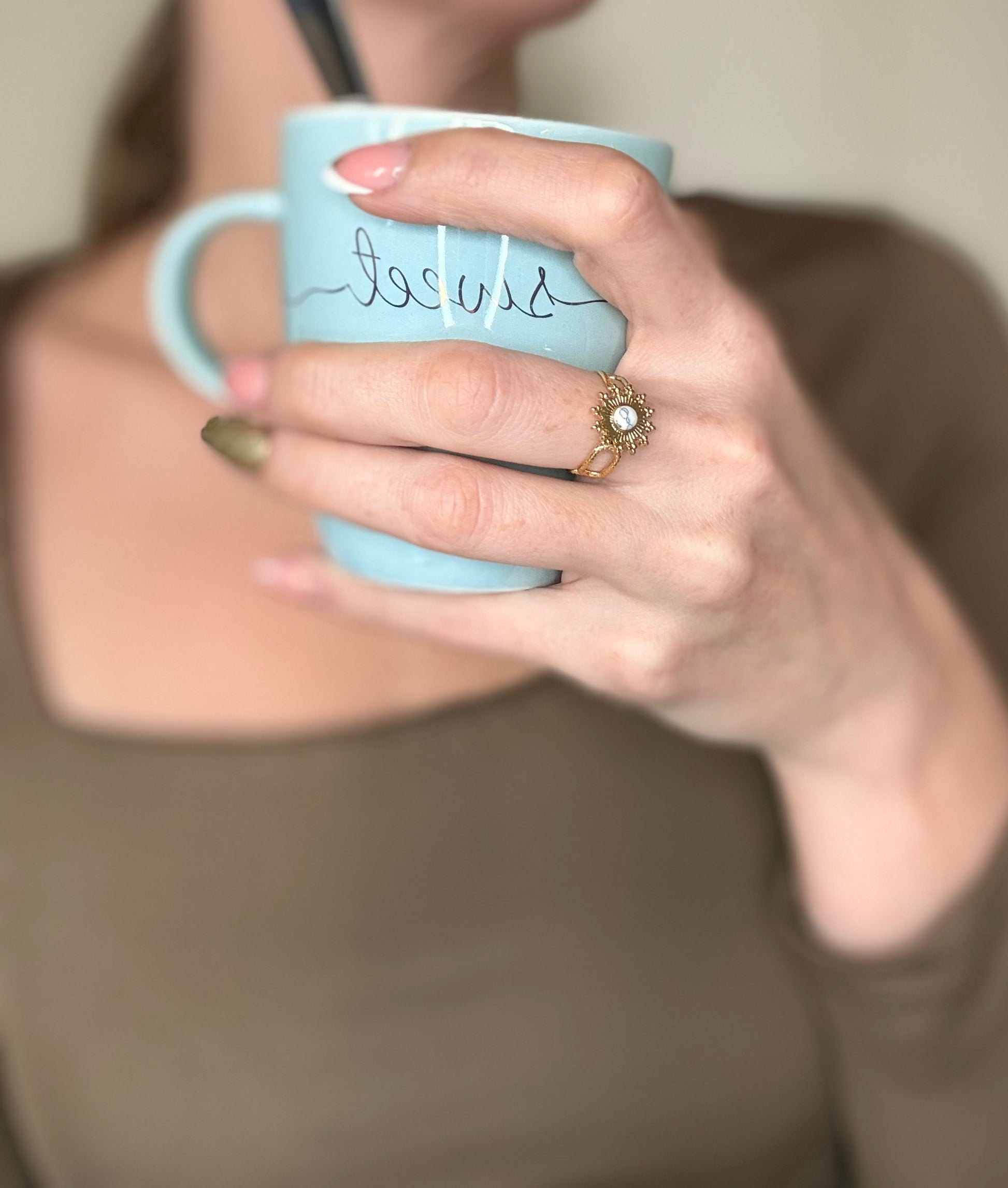 Son anneau finement travaillé met en valeur un soleil rayonnant autour d'une perle lumineuse, créant un bijou à la fois doux et éclatant. Elle illumine chaque main avec subtilité etcharme, apportant une touche bohème et solaire à ton style.