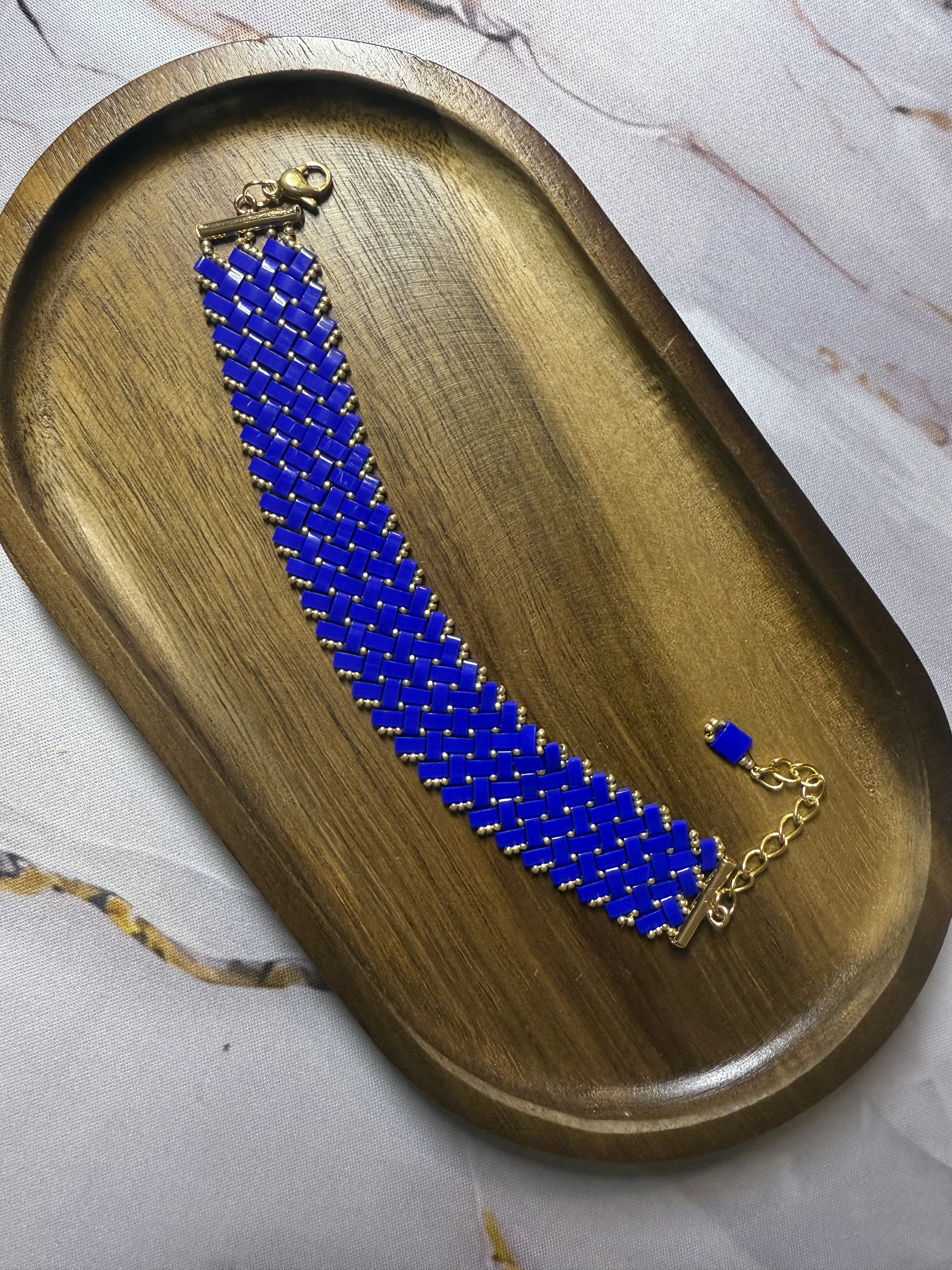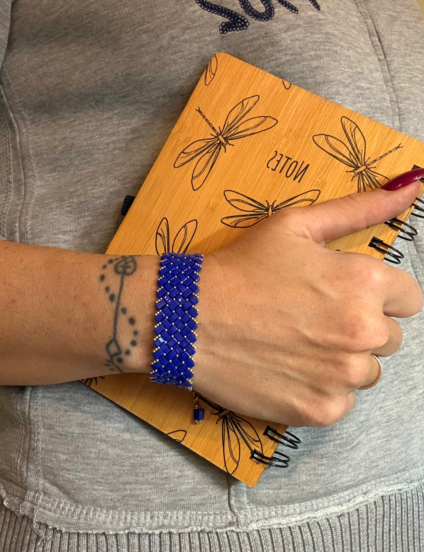 Son tissage délicat de perles en verre Miyuki Half Tila forme un motif harmonieux qui évoque la précision et le savoir-faire artisanal. D'un bleu profond rappelant les reflets hypnotiques du saphir, il incarne à la fois la force et l'élégance. Ce bracelet est l'allié parfait pour sublimer chaque tenue avec une touche distinctive.