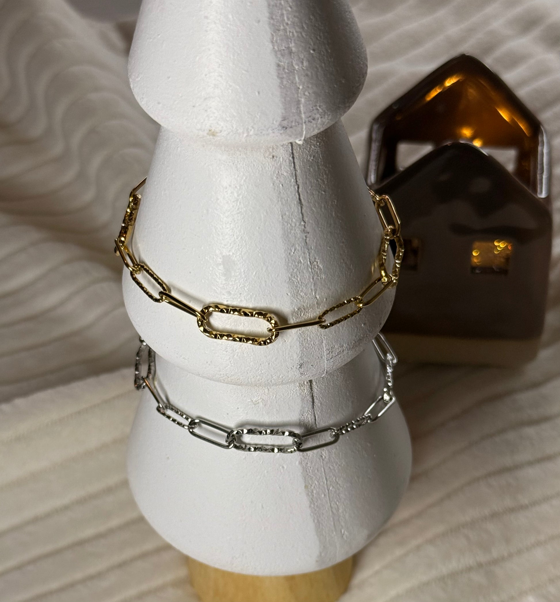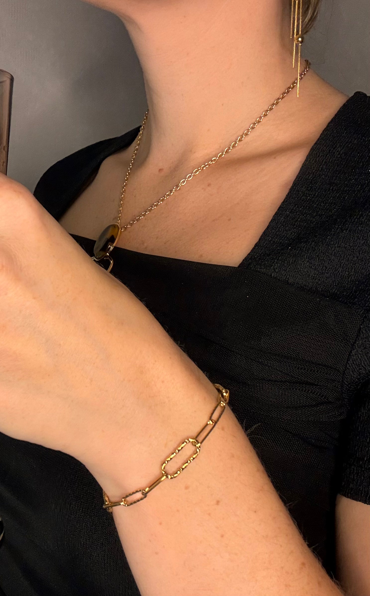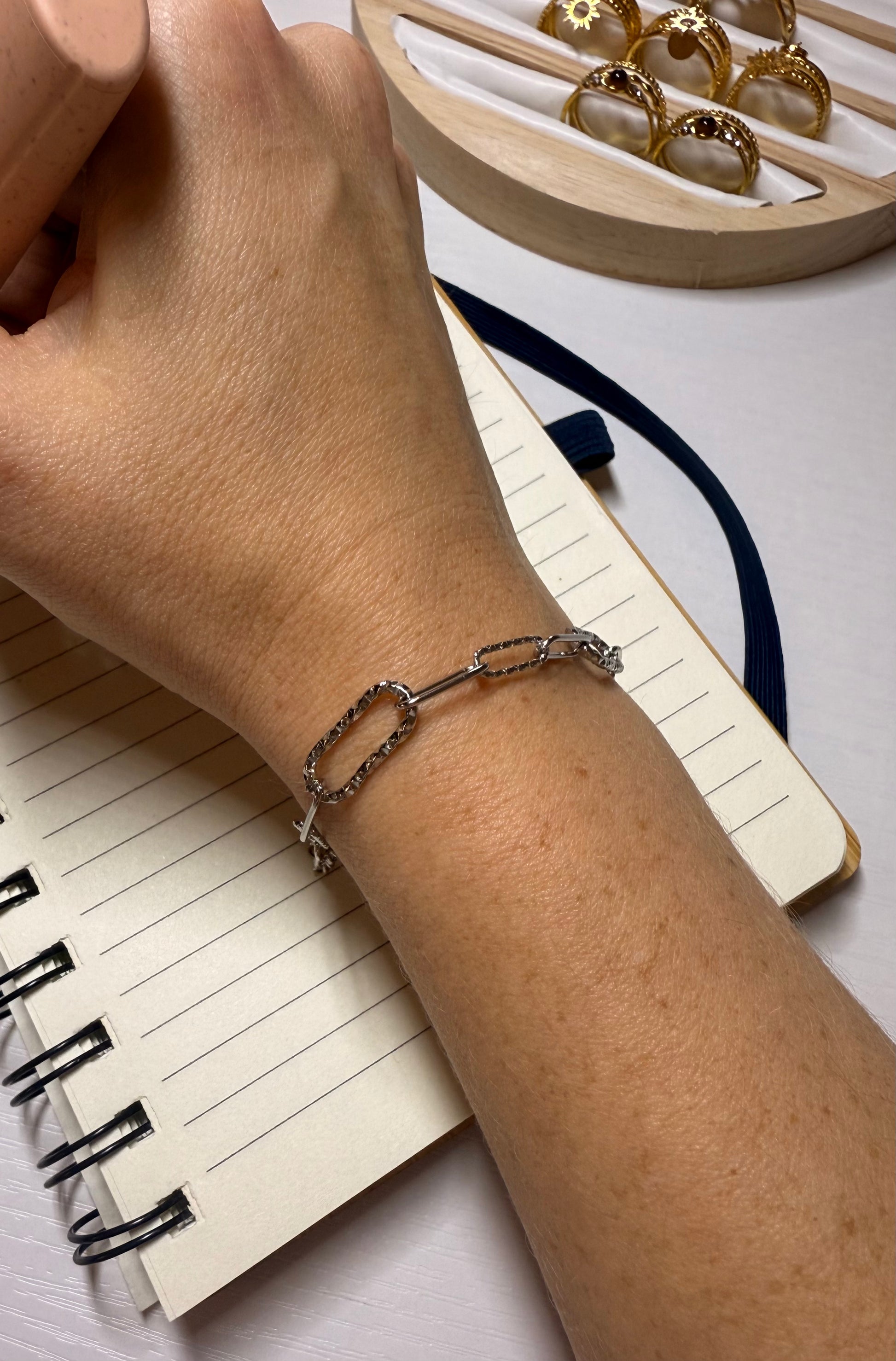 Composé de maillons allongés texturés, il joue avec la lumière et apporte une touche distinctive à votre poignet. À la fois audacieux et intemporel, il se porte seul pour un style épuré ou en accumulation pour un look plus affirmé.