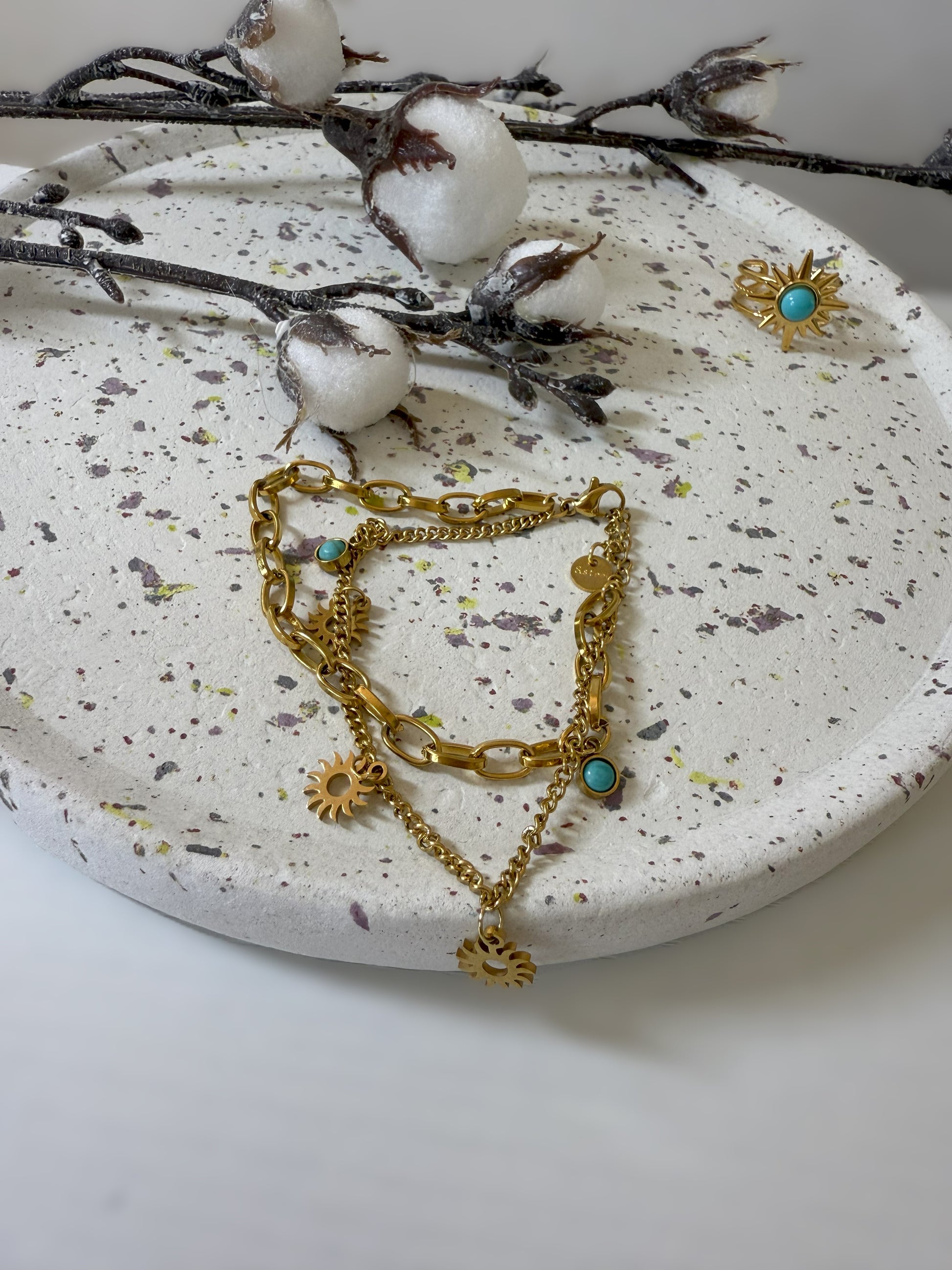 Orné de délicates pierre turquoise et de charms solaires, il apporte une touche bohème et lumineuse à votre style. Son design raffiné et aérien s'adapte à toutes les occasions, du quotidien aux moments les plus spéciaux.