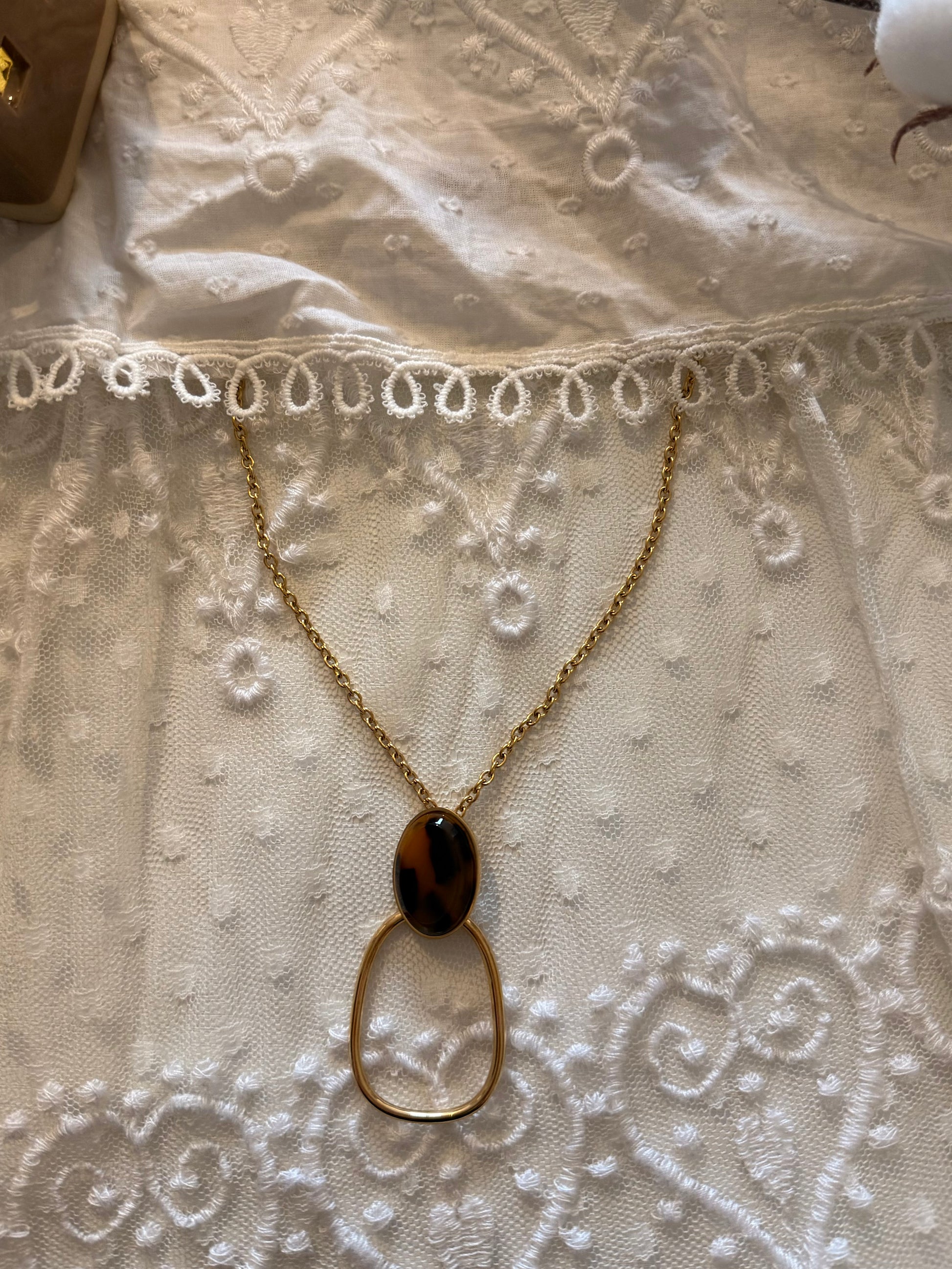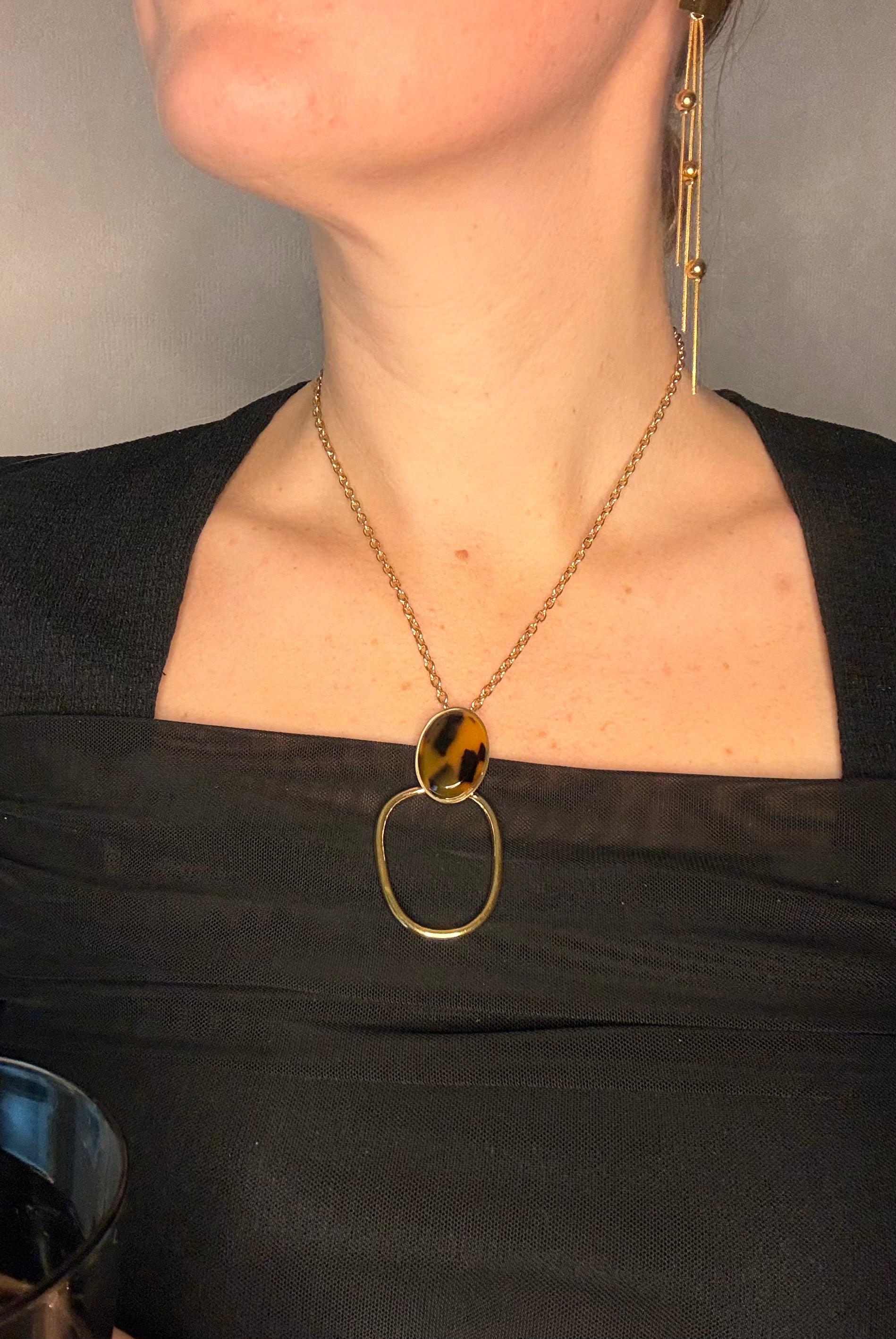 Son pendentif en acétate façon écaille, associé à une structure dorée minimaliste, apporte une touche moderne et affirmée à votre tenue. Ce bijou long sublime le port de tête et se marie à la perfection avec des looks sophistiqués ou plus décontractés. Son allure distinctive et son jeu de matières en font un accessoire unique à adopter sans hésiter.