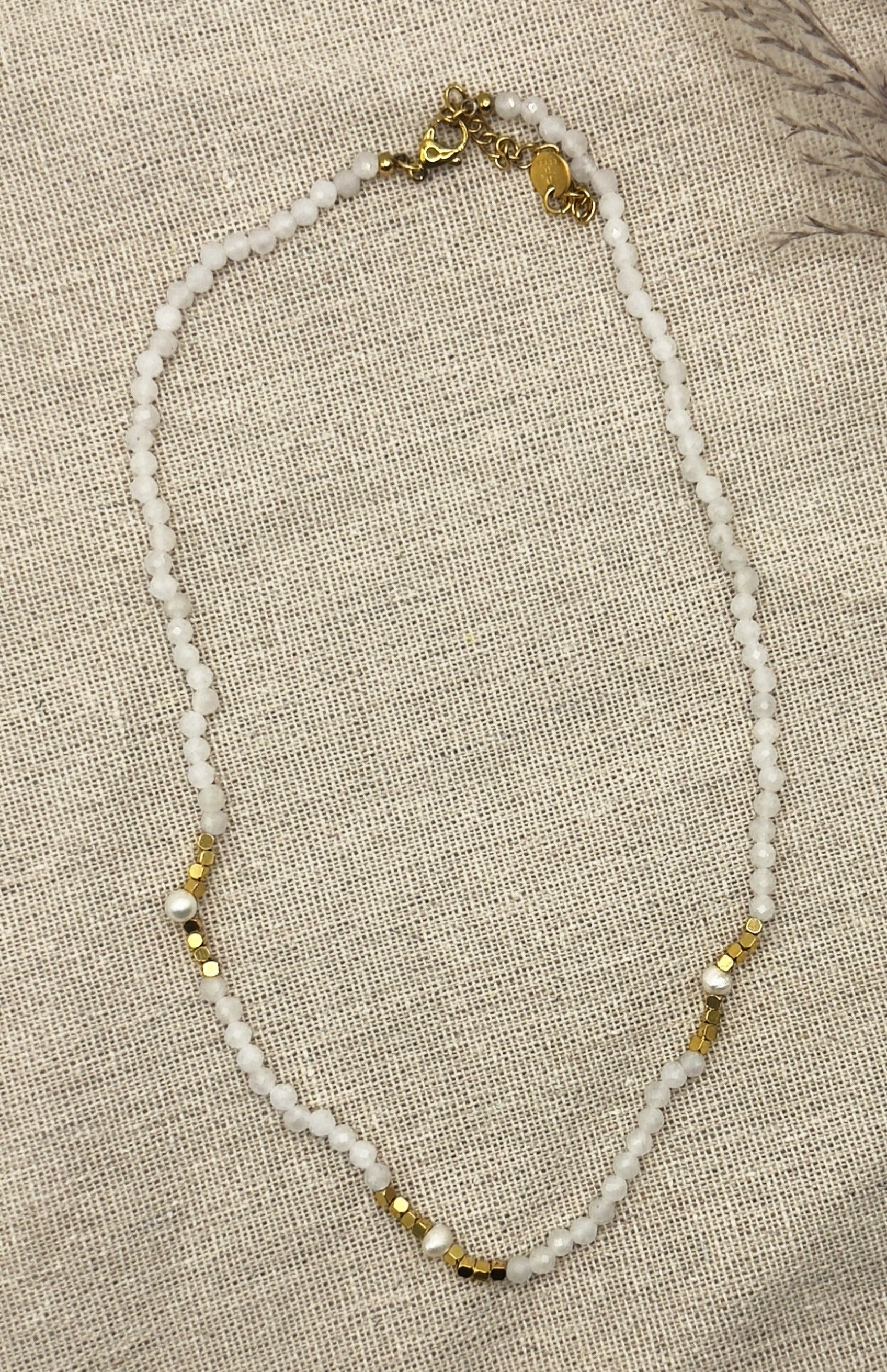 Composé de perles en pierres naturelles facettées, de perles d'eau douce et de détails dorés, il apporte une touche bohème et lumineuse à ton style. Parfait en accumulation ou porté seul, Delia est le bijou idéal pour une allure subtile et sophistiquée.
