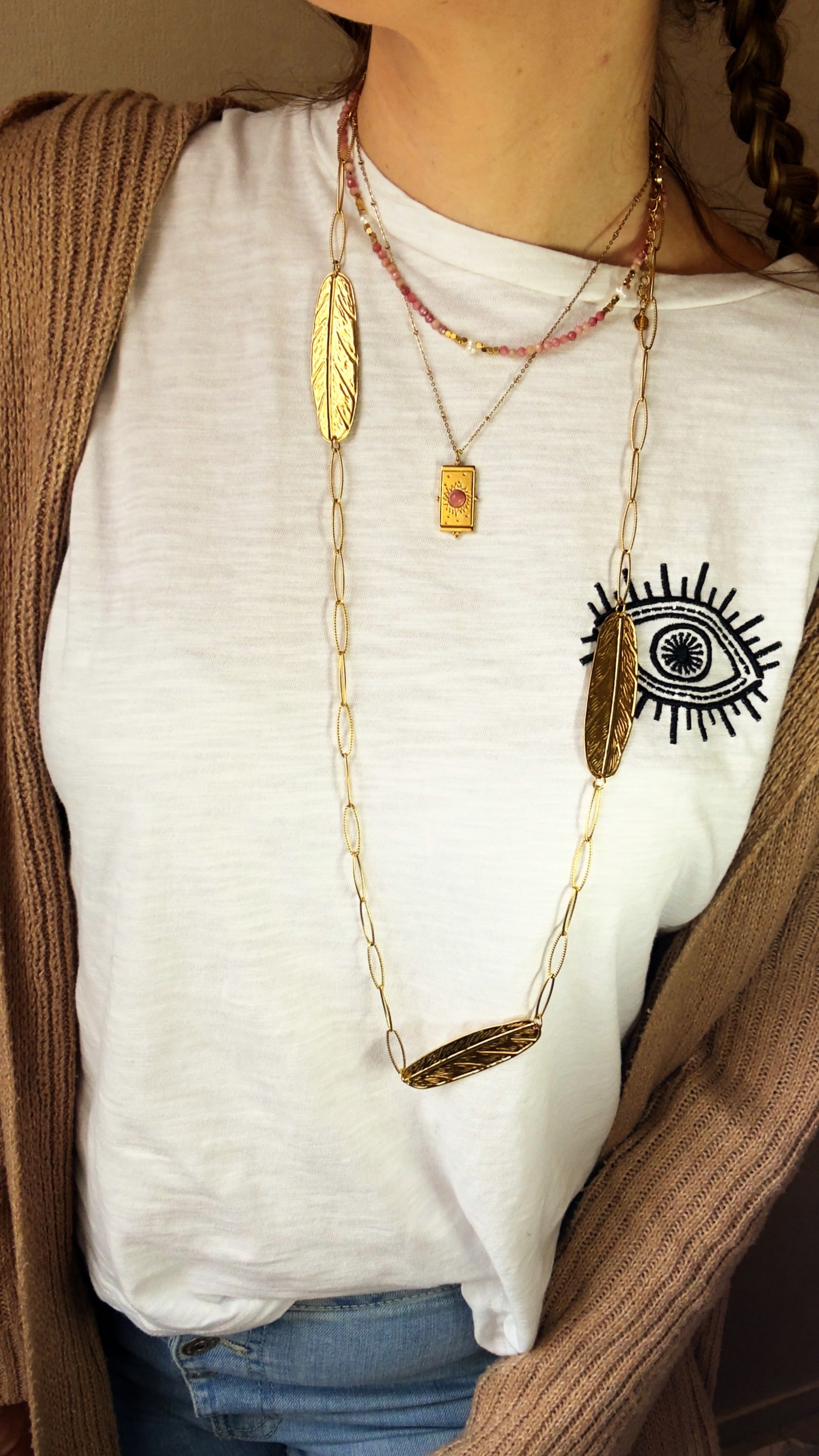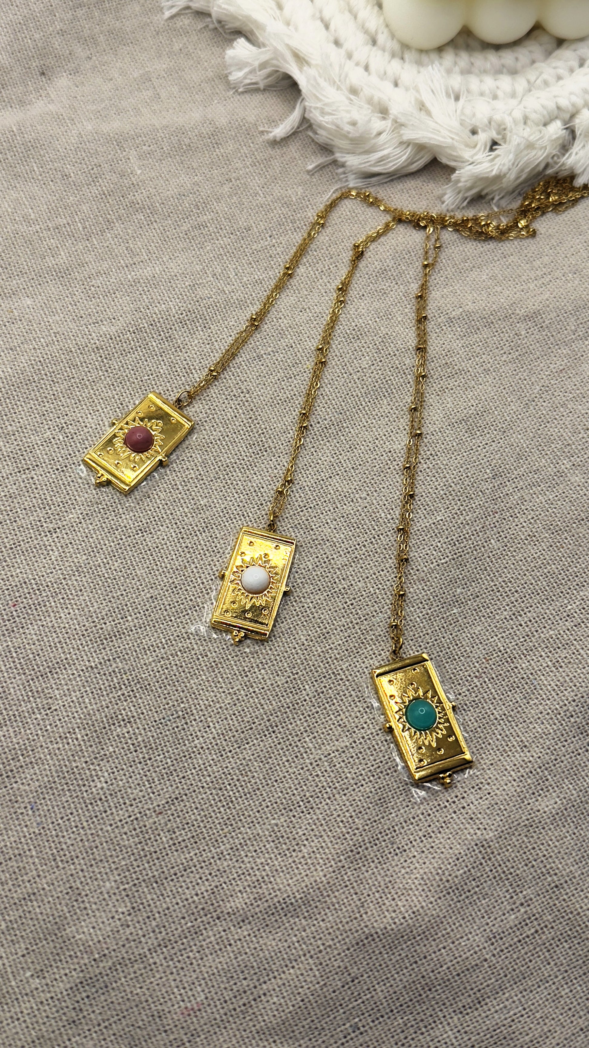 Plonge dans l'univers mystique de Luna, un collier délicat et raffiné qui mêle l'éclat doré de l'acier inoxydable à la puissance des pierres naturelles.