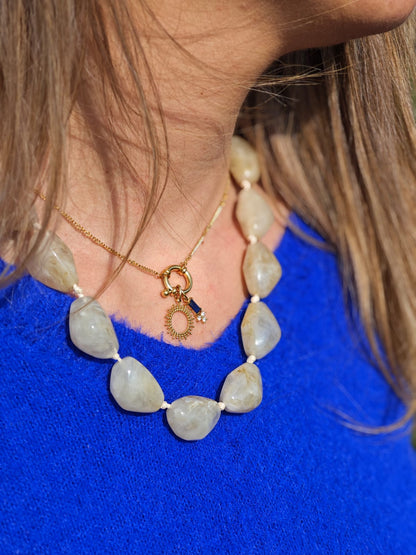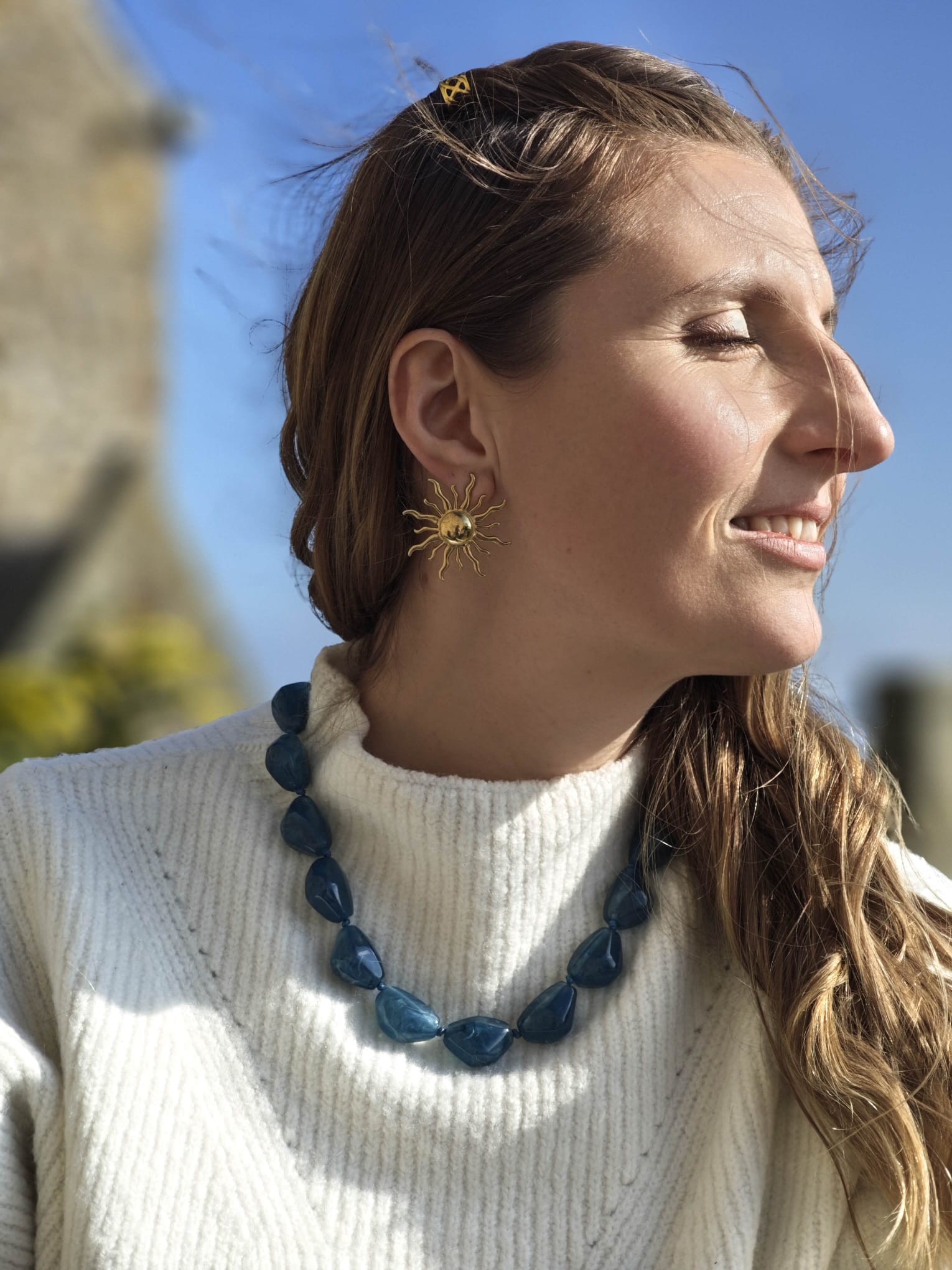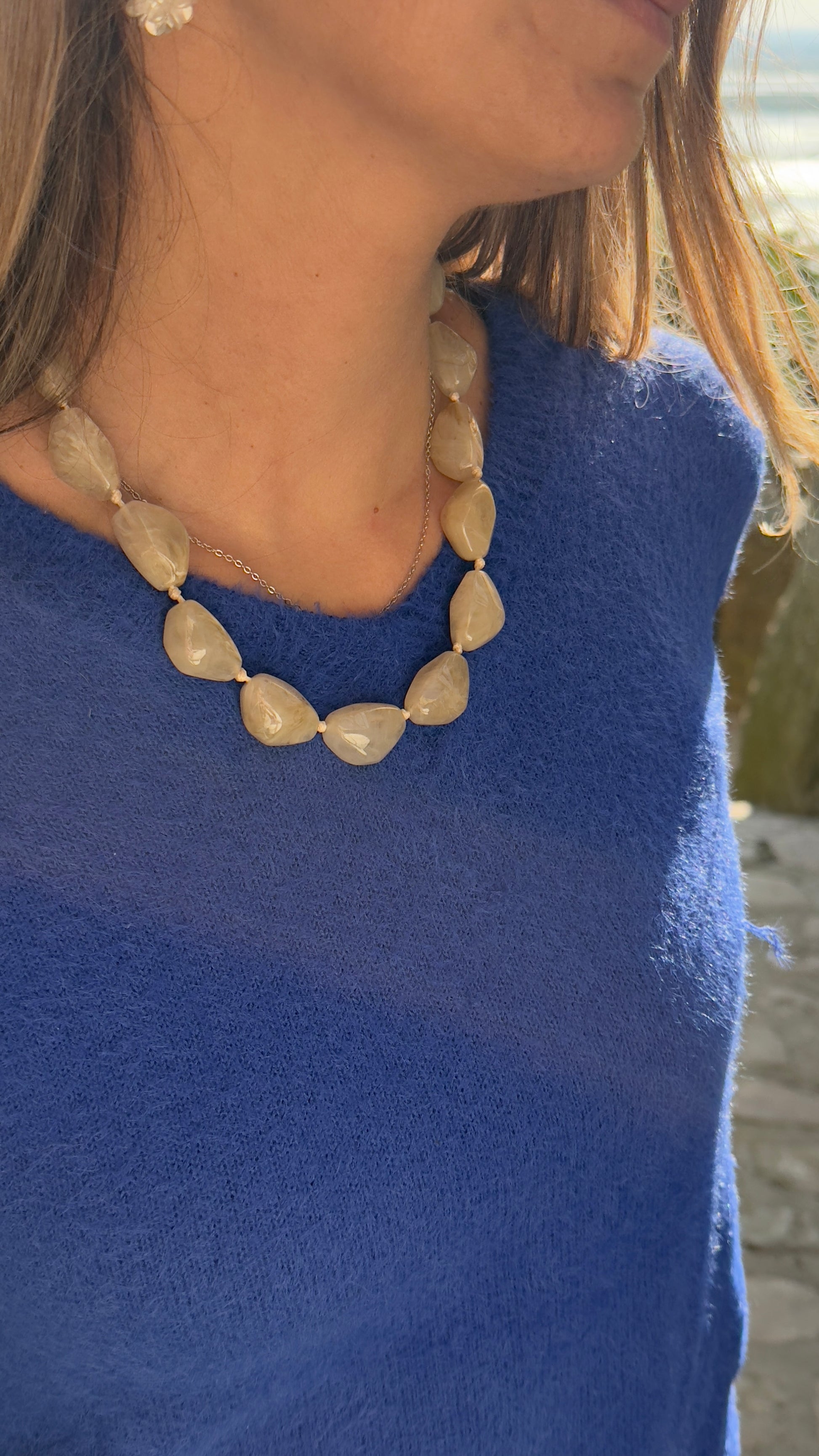Ses perles de résine aux nuances marbrées évoquent à la fois la douceur du sable et la profondeur des océans. Son design épuré, sublimé par des finitions dorées, en fait un bijou élégant et intemporel, parfait pour illuminer vos tenues en toute simplicité.