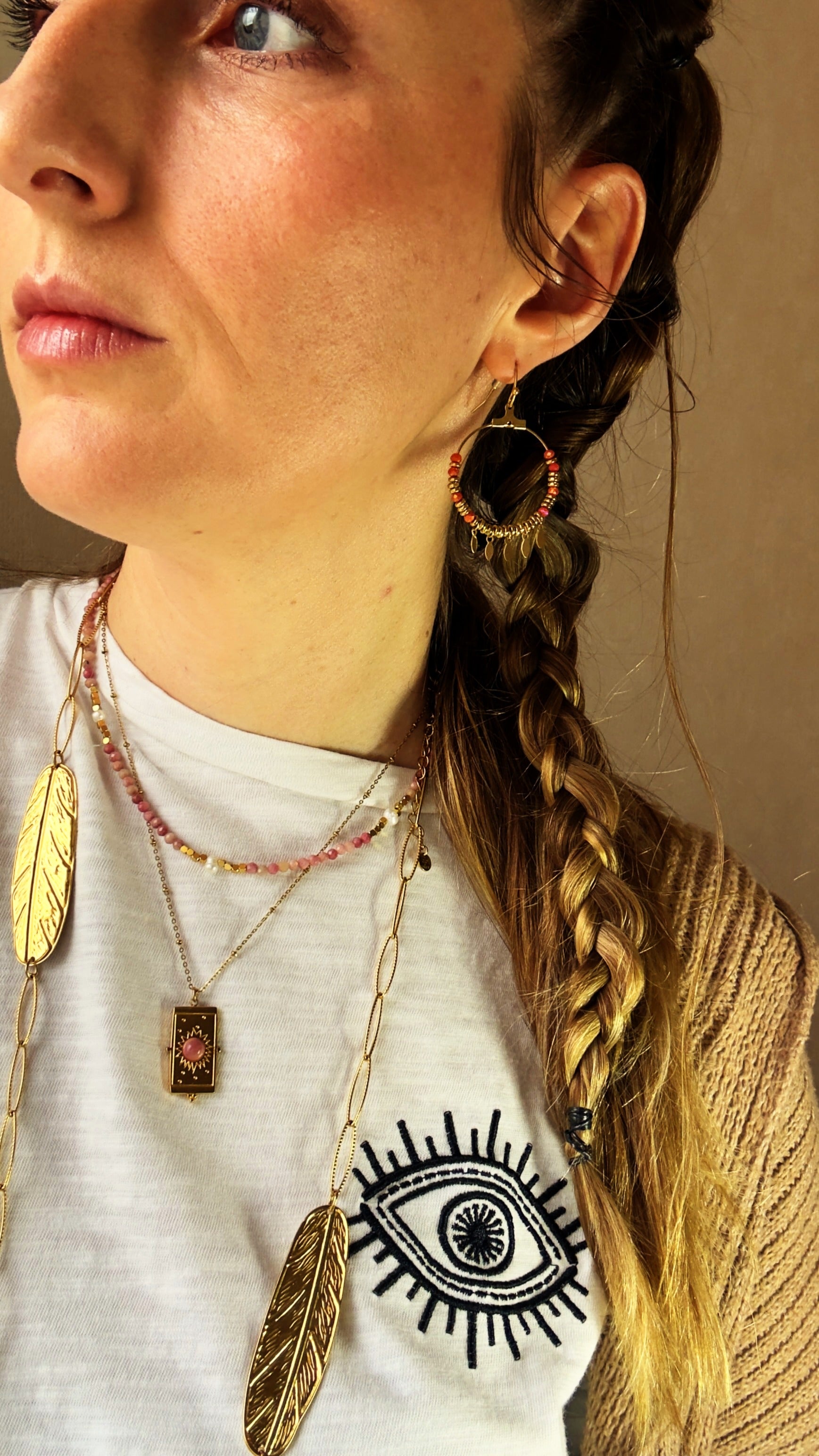 Leur pierre naturelle centrale apporte une touche authentique et bohème, tandis que leur finition dorée sublime ton visage avec douceur et éclat naturel. Shana est le bijou idéal pour celles qui veulent allier élégance et caractère.