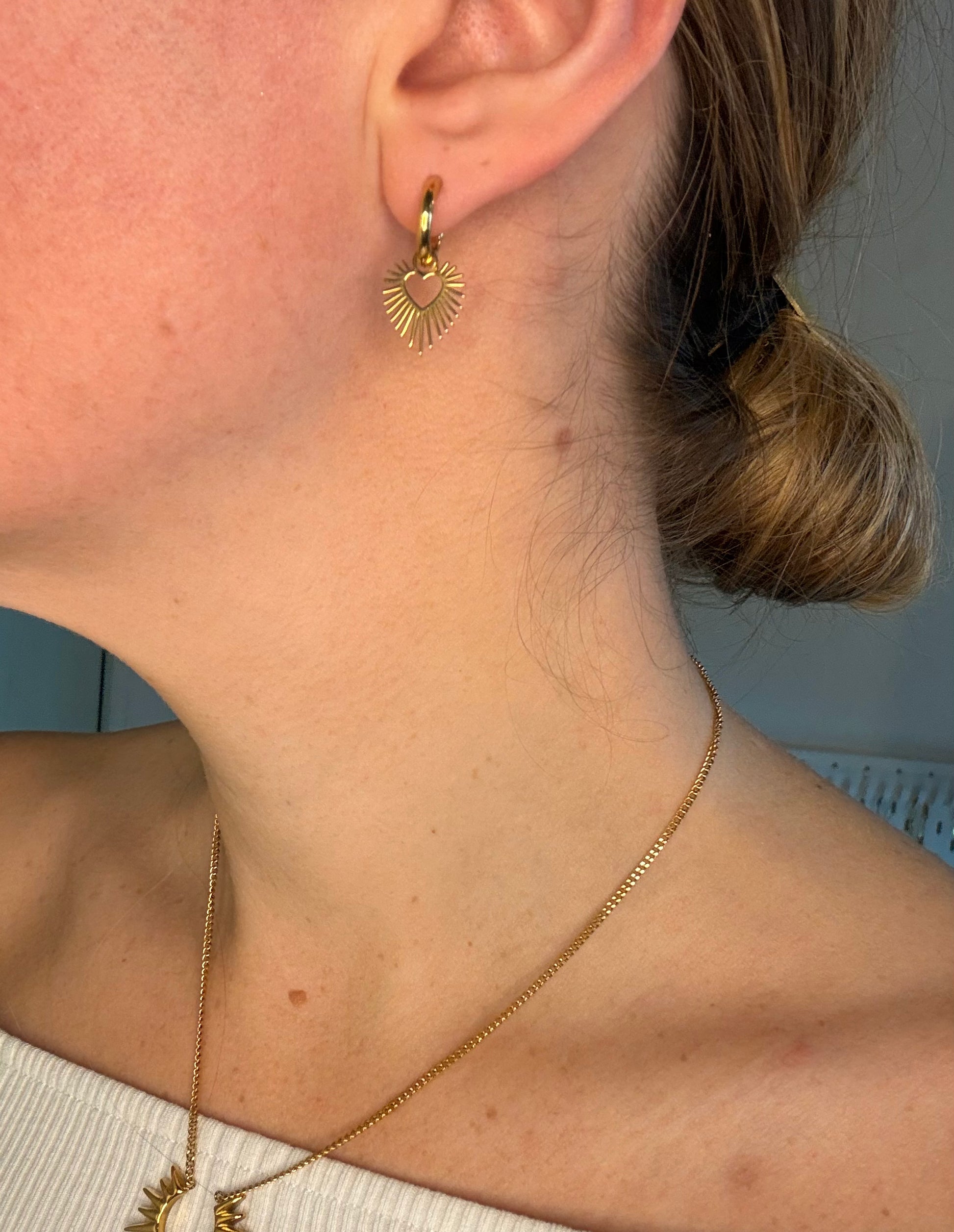 Leur pendentif en forme de coeur rayonnant apporte une touche de douceur contrastant avec la force de leur structure dorée. Subtiles et marquantes à la fois, elles illuminent le visage avec un éclat unique. Parfaites pour toutes les occasions, elles ajoutent une signature lumineuse à ton style.