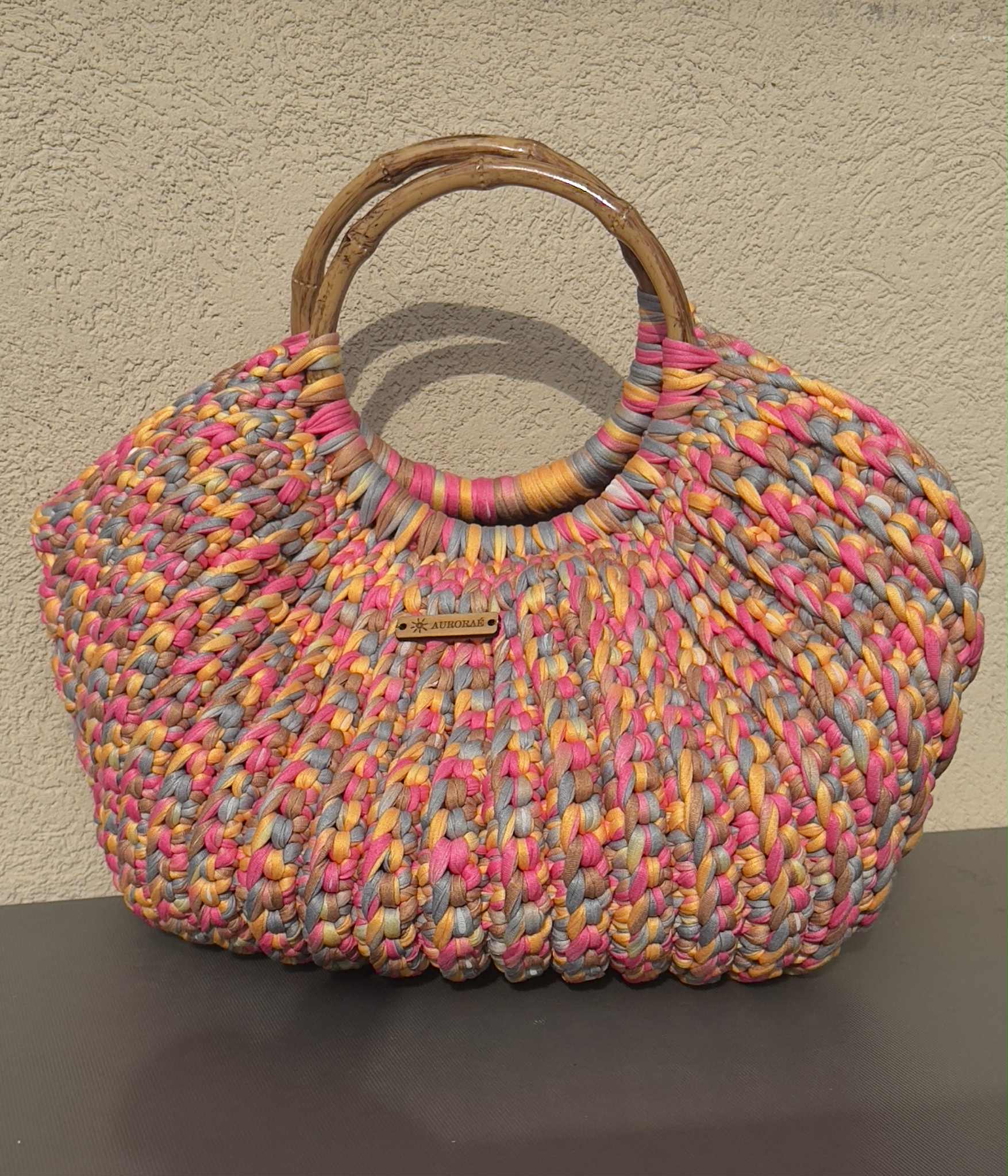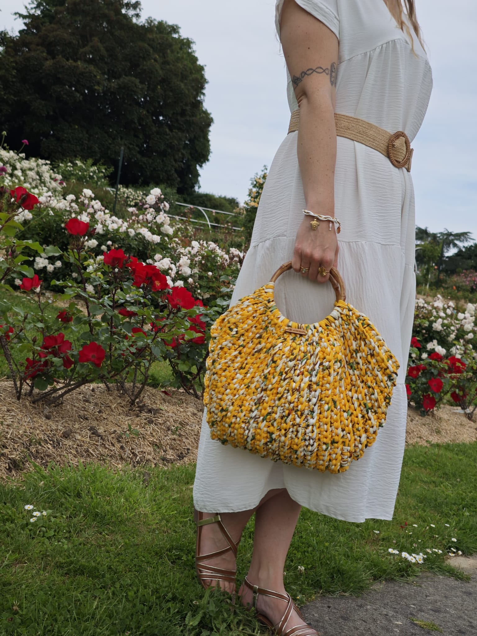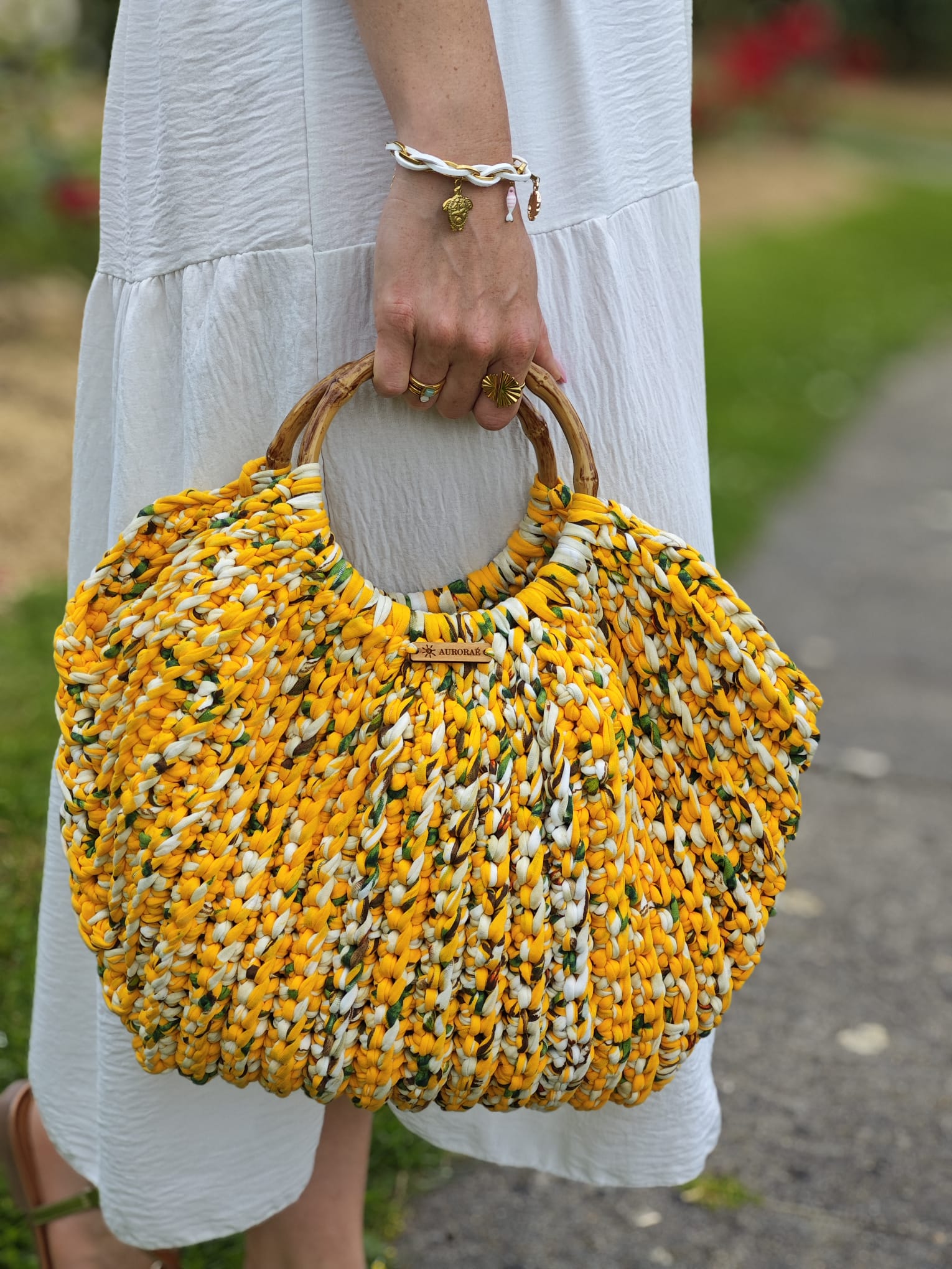 Avec ses nuances éclatantes de jaune, blanc et noir, et son volume souple et généreux, il incarne les journées d'été bien remplies - entre marchés, pique-niques, escapades ou virées plage. Crocheté d'une seule pièce à la main, il repose sur de superbes anses en résine effet bambou, pour un rendu naturel et plein de charme.