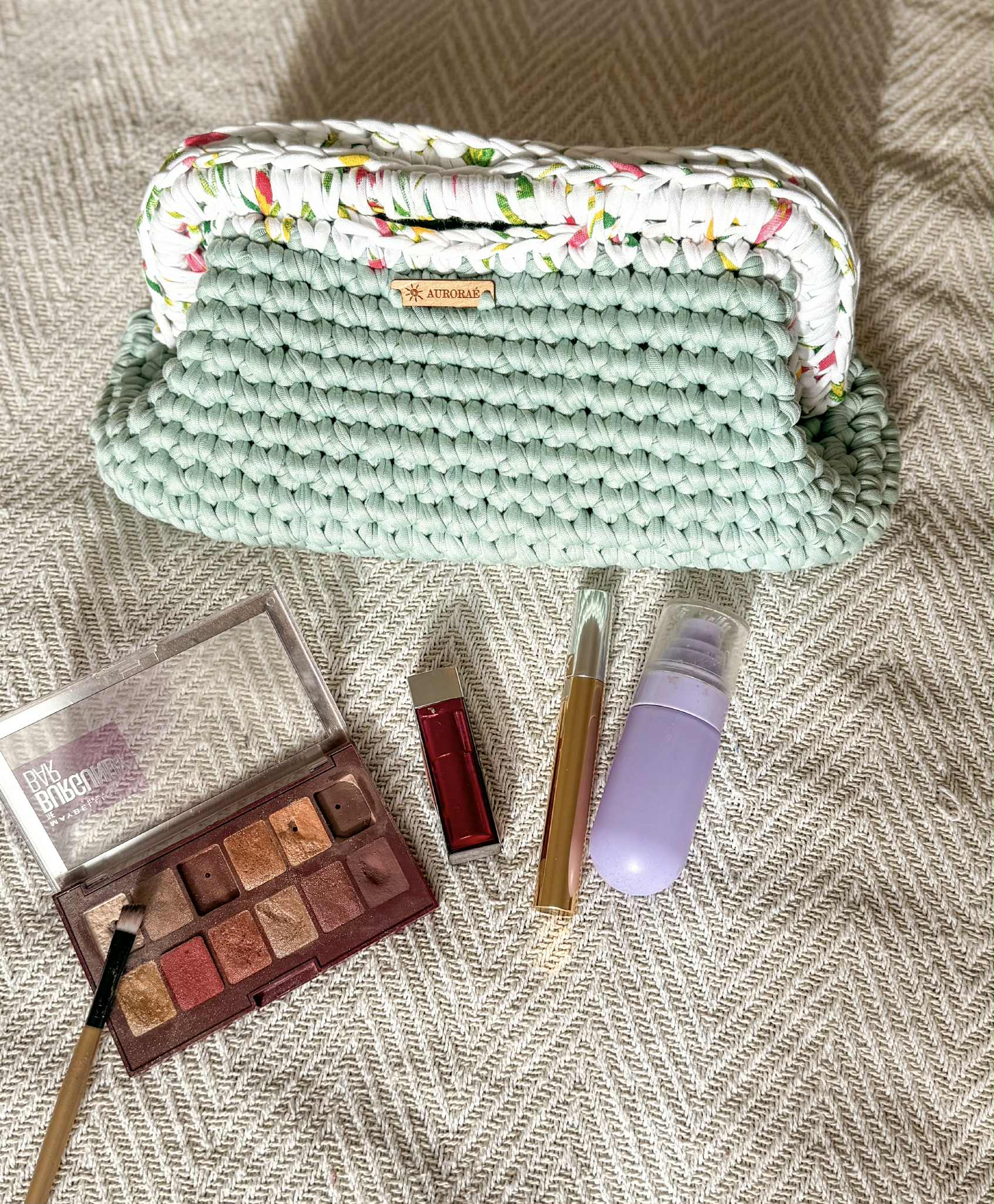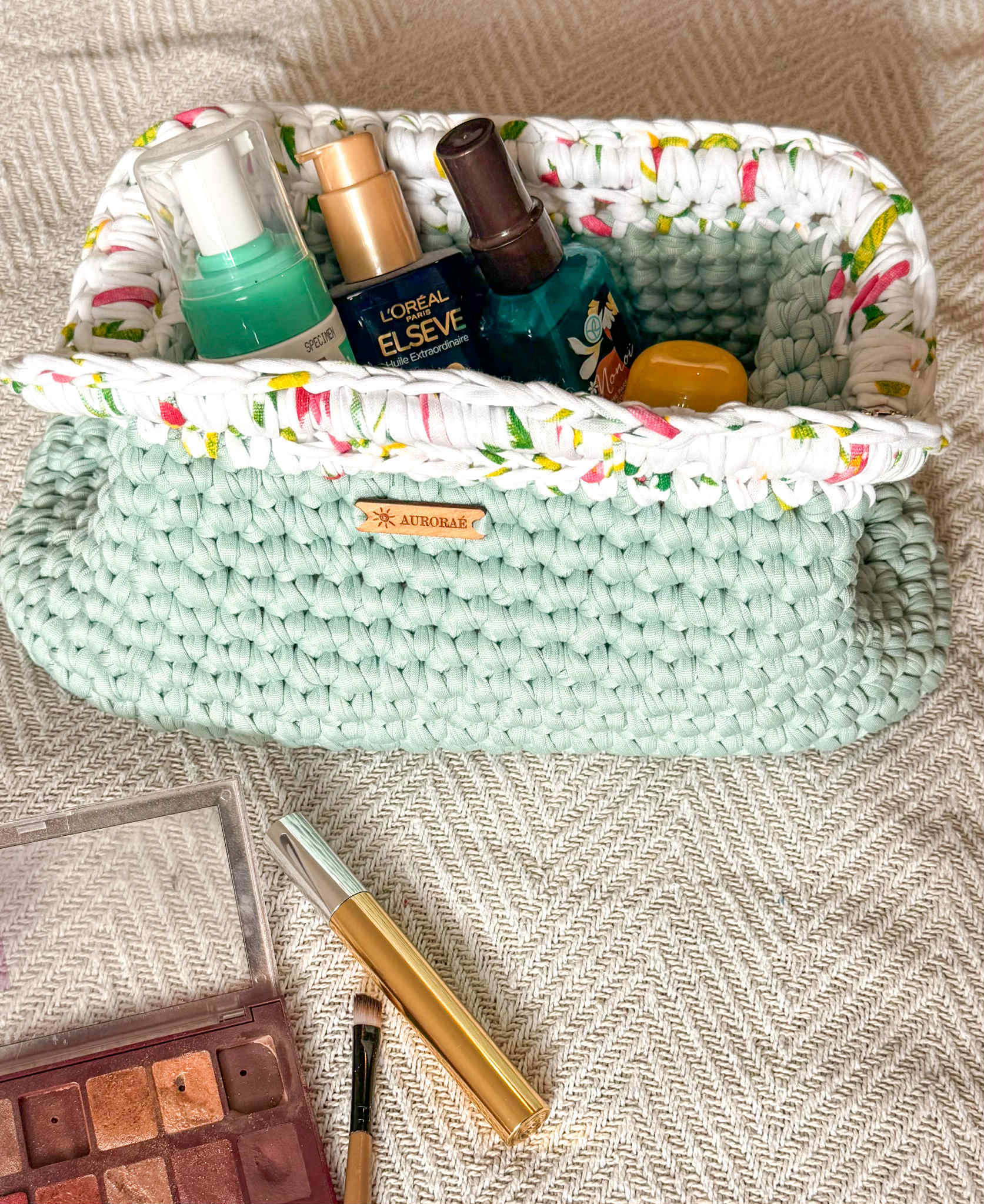 Fait main en crochet avec une doublure fleurie pleine de pep's, il peut se transformer en sac de sortie, en pochette beauté ou en trousse de voyage.