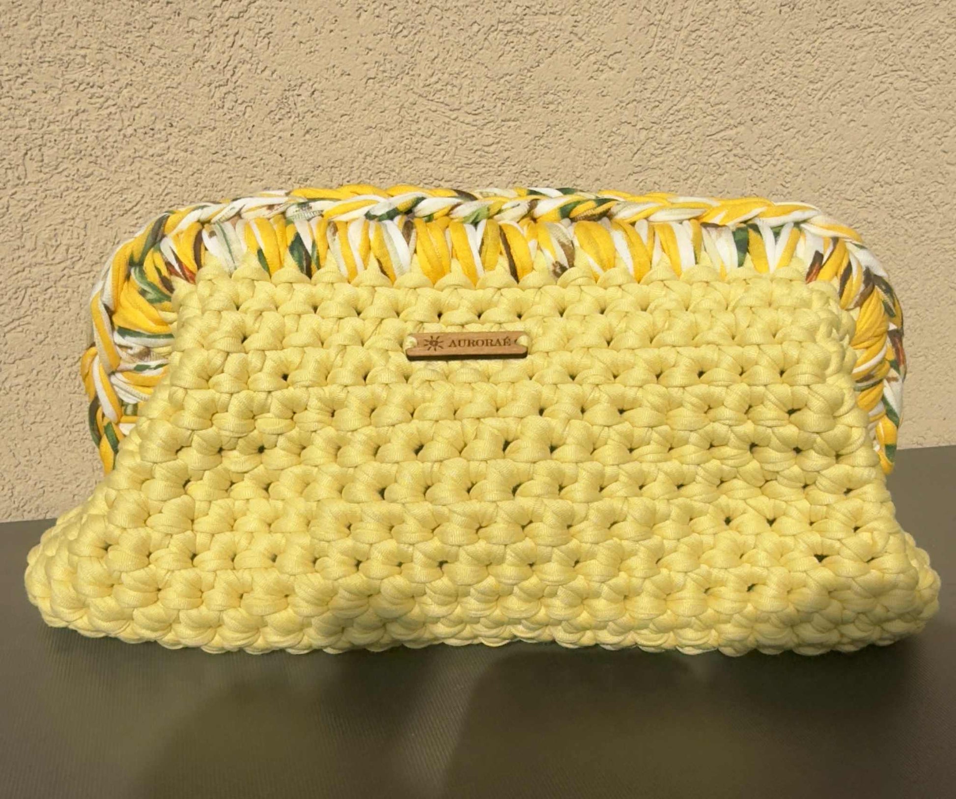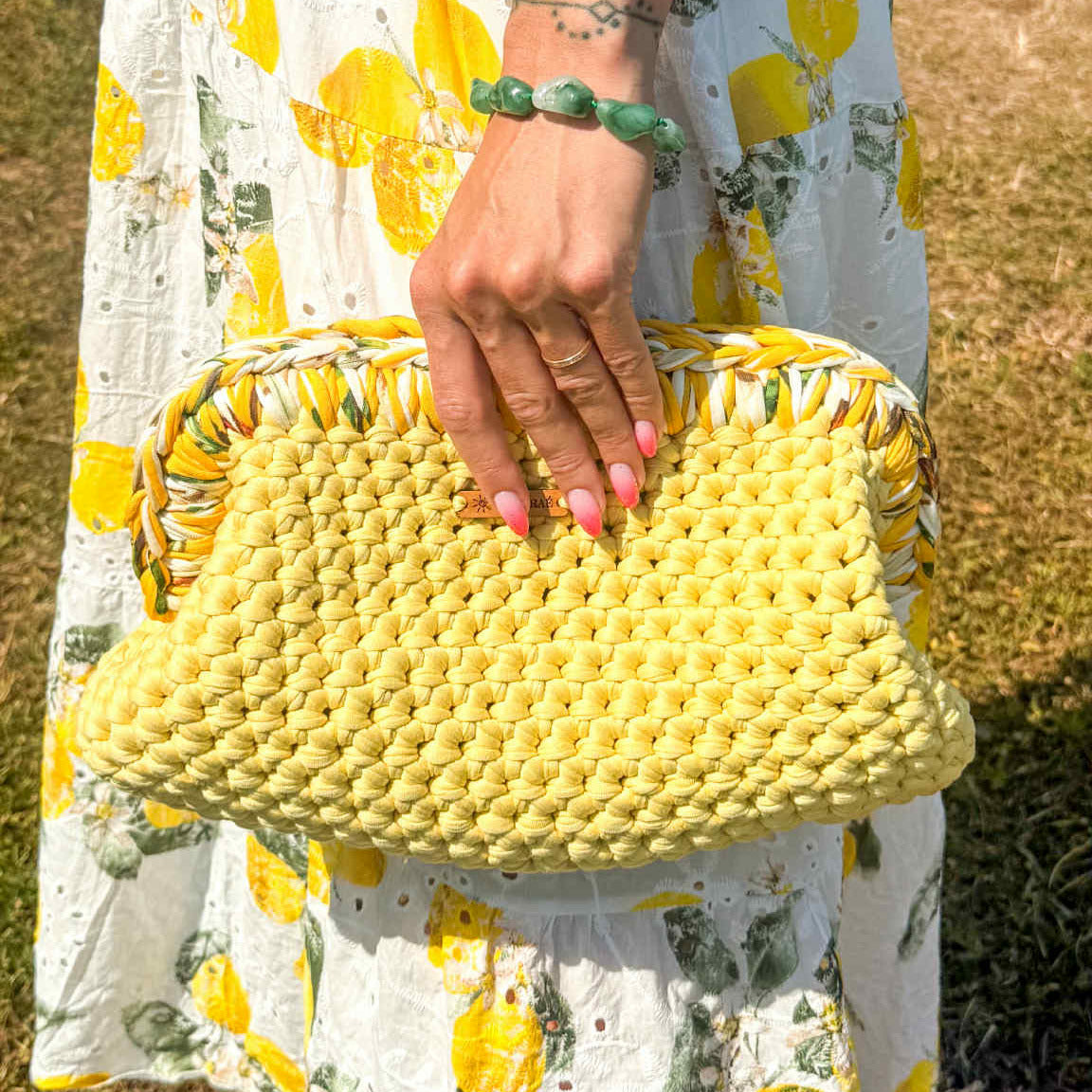 Entièrement fait main au crochet, il séduit par sa couleur ensoleillée et sa doublure aux accents fruités, rappelant les saveurs gourmandes et la dolce vita italienne.
