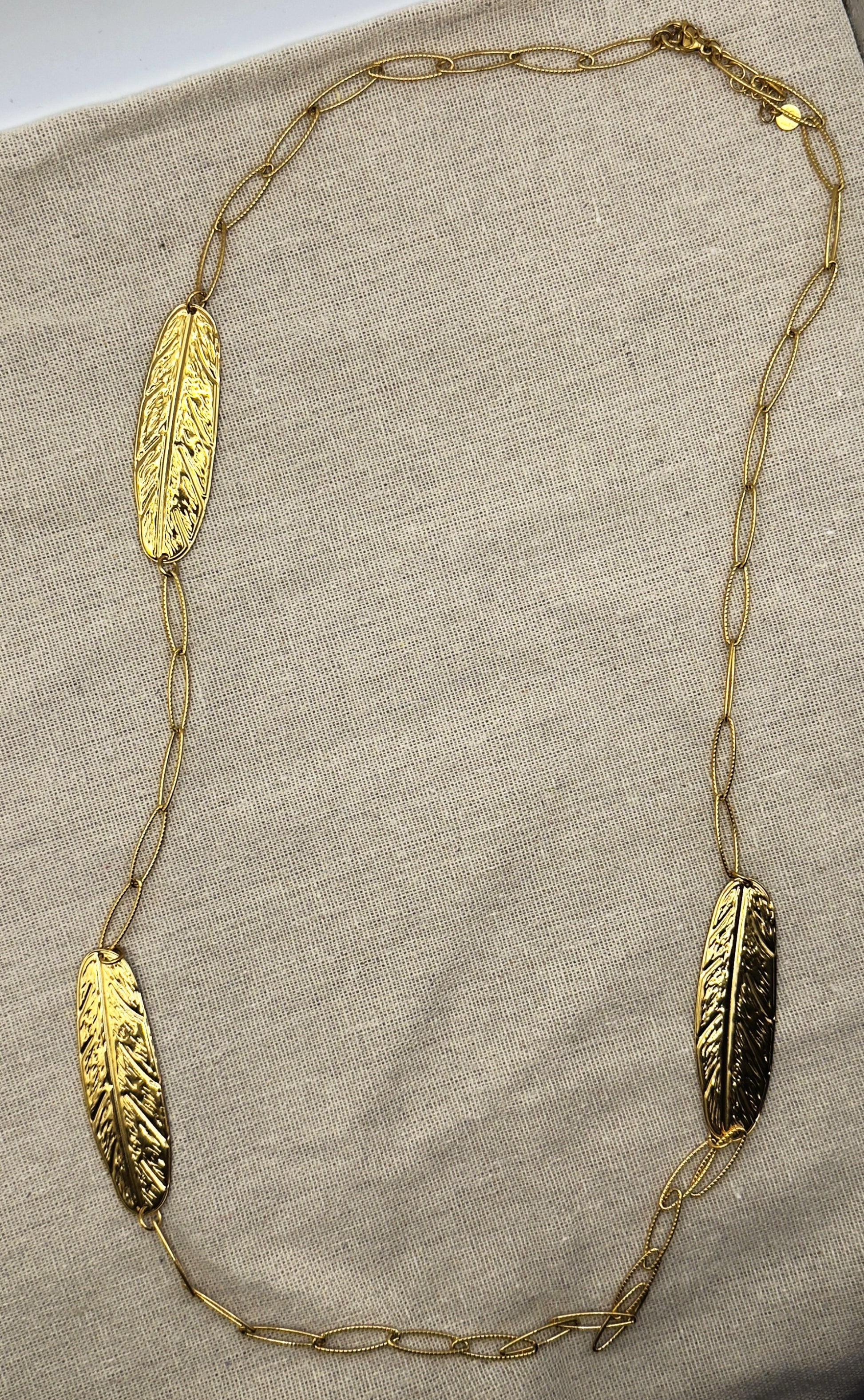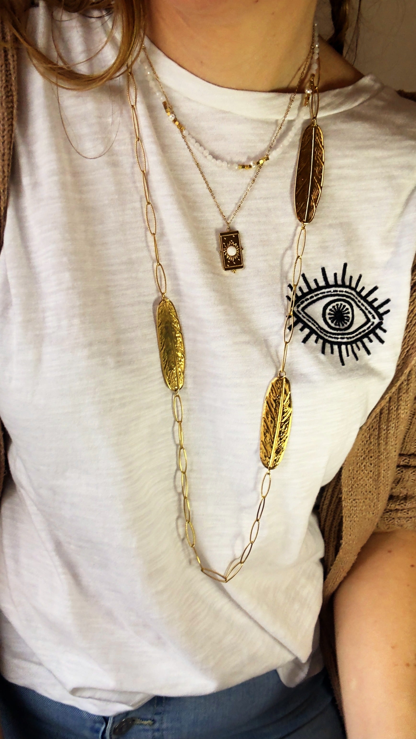 Orné de trois pendentifs gravés en forme de plume, il symbolise la liberté, la légèreté et l'élégance intemporelle. Sa chaine en maillons allongés apporte une touche délicate et tendance, parfaite pour sublimer tes tenues en toute saison.
